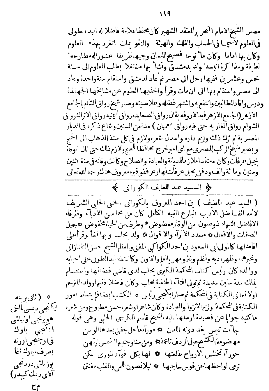 السيد عبد اللطيف بن أحمد المعروف بالكوراني الحنفي الحلبي الشريف لأمه الفاضل الأديب البارع النبيه الكامل كان من محاسن الأدباء وظرفاء الأفاضل النبهاء ذو صون من الوقار مغضوض وطرف من الحياء مخفوض جميل الصفات والأفعال مسدد الآراء والأقوال ولد بحلب وبها نشأ وقرأ على أفاضلها كالمولى أبي السعود بن أحمد الكواكبي المفتي والعالم الشيخ حسن التفتازاني وغيرهما وظهر أدبه ونظم ونثر ومهر بالعلم والفنون وكانت له اليد الطولى على أحبابه ووالده كان رئيس كتاب المحكمة الكبرى بحلب لدى قاضي قضاتها واستقام بذلك مدة سنين مديدة ثم تولى افتاء الحنفية بحلب وكان فاضلاً فقيهاً وولده المترجم أولاً تعاني الكتابة في المحكمة ثم صار ايكنجي رئيس الكتاب أيضاً فلم يتعاط أمور الكتابة في المحكمة ولزم الانزوا والعبادة وكان شاعراً وشعره حسن مطبوع ومن شعره ما كتبه جواباً عن قصيدة أرسلها إليه الشيخ قاسم البكرجي الحلبي وهي قوله
