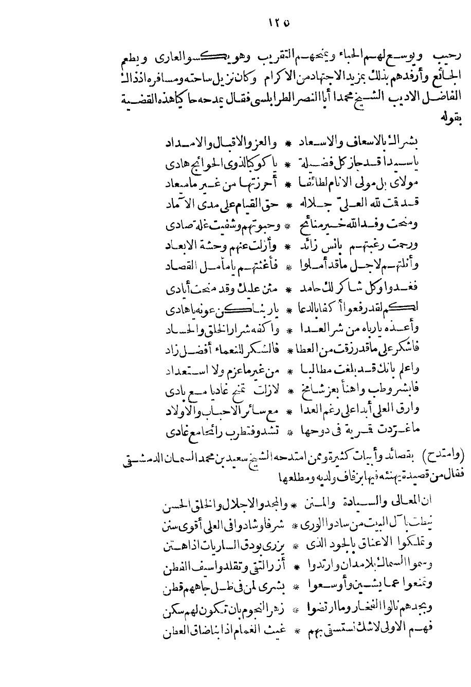 رحيب ويوسع لهم الحباء ويمنحهم التقريب وهو يكسو العاري ويطعم الجائع وأرفدهم بذلك بمزيد الاجتهاد من الاكرام وكان نزيل ساحته ومسافره إذ ذاك الفاضل الأديب الشيخ محمداً أبا النصر الطرابلسي فقال يمدحه حاكياً هذه القضية بقوله