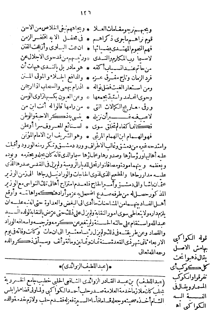 عبد اللطيف بن عبد القادر الزوائدي الشافعي الحلبي خطيب جامع الخسروية بحلب كان ملازماً خدمة العلامة صدر حلب أحمد الكواكبي ولما ولي قضاء طرابلس الشام أخذه صحبته وجعله قساماً فأساء السيرة فعزله فقدم حلب ولازم خدمة والده