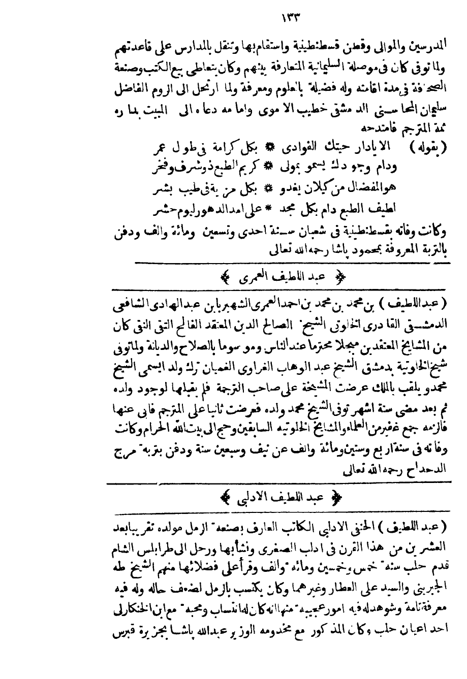 عبد اللطيف بن محمد بن محمد بن أحمد العمري الشهير بابن عبد الهادي الشافعي الدمشقي القادري الخلوتي الشيخ الصالح الدين المعتقد الفالح التقي النقي كان من المشايخ المعتقدين مبجلاً محترماً عند الناس وموسوماً بالصلاح والديانة ولما توفي شيخ الخلوتية بدمشق الشيخ عبد الوهاب الغراوي الغميان ترك ولداً يسمى الشيخ محمد ويلقب بالملك عرضت المشيخة على صاحب الترجمة فلم يقبلها لوجود ولده ثم بعد مضي ستة أشهر توفي الشيخ محمد ولده فعرضت ثانياً على المترجم فأبى عنها فألزمه جمع غفير من العلماء والمشايخ الخلوتية السابقين وحج إلى بيت الله الحرام وكانت وفاته في سنة أربع وستين ومائة وألف عن نيف وسبعين سنة ودفن بتربة مرج الدحداح رحمه الله تعالى.