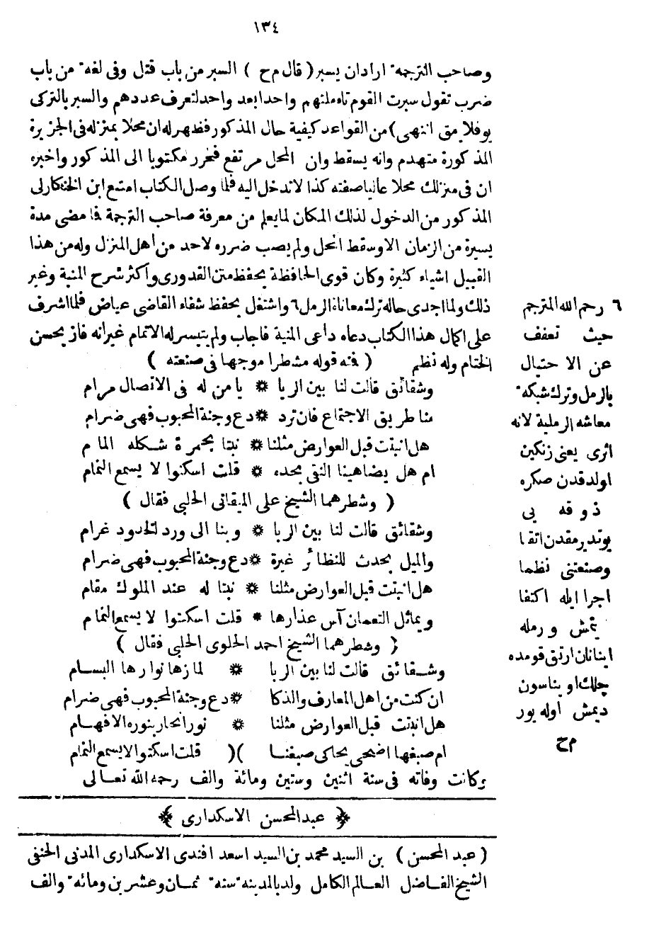 عبد المحسن بن السيد محمد بن السيد أسعد أفندي الأسكداري المدني الحنفي الشيخ الفاضل العالم الكامل ولد بالمدينة سنة ثمان وعشرين ومائة وألف