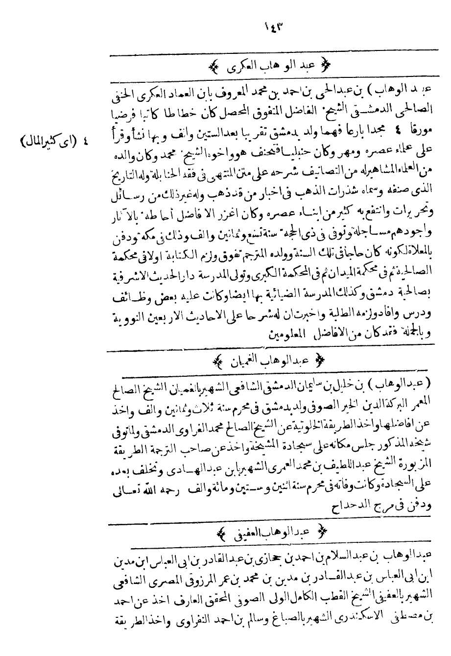 عبد الوهاب بن عبد الحي بن أحمد بن محمد المعروف بابن العماد العكري الحنفي الصالحي الدمشقي الشيخ الفاضل المتفوق المحصل كان خطاطاً كاتباً فرضياً مورقاً مجداً بارعاً فهماً ولد بدمشق تقريباً بعد الستين وألف وبها نشأ وقرأ على علماء عصره ومهر وكان حنبلياً فتحنف هو وأخوه الشيخ محمد وكان والده من العلماء المشاهير له من التصانيف شرحه على متن المنتهى في فقه الحنابلة وله التاريخ الذي صنفه وسماه شذرات الذهب في أخبار من قد ذهب وله غير ذلك من رسائل وتحريرات وانتفع به كثير من أبناء عصره وكان أغزر الأفاضل احاطة بالآثار وأجودهم مساجلة وتوفي في ذي الحجة سنة تسع وثمانين وألف وذلك في مكة ودفن بالمعلاة لكونه كان حاجاً في تلك السنة وولده المترجم تفوق ولزم الكتابة أولاً في محكمة الصالحية ثم في محكمة الميدان ثم في المحكمة الكبرى وتولى المدرسة دار الحديث الأشرفية بصالحية دمشق وكذلك المدرسة الضيائية بها أيضاً وكانت عليه بعض وظائف ودرس وأفاد ولزمه الطلبة وأخبرت أن له شرحاً على الأحاديث الأربعين النووية وبالجملة فقد كان من الأفاضل المعلومين.