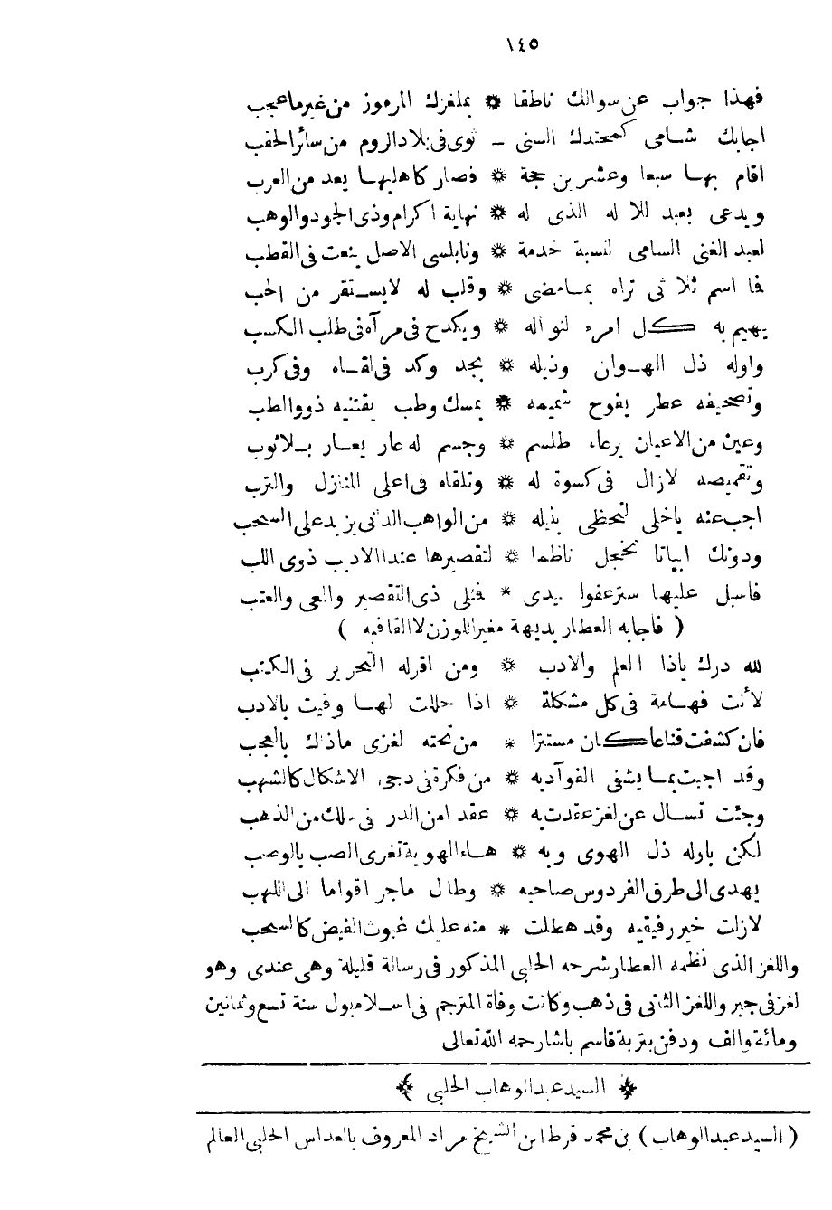واللغز الذي نظمه العطار شرحه الحلبي المذكور في رسالة قليلة وهي عندي وهو لغز في جبر واللغز الثاني في ذهب وكانت وفاة المترجم في اسلامبول سنة تسع وثمانين ومائة وألف ودفن بتربة قاسم باشا رحمه الله تعالى.