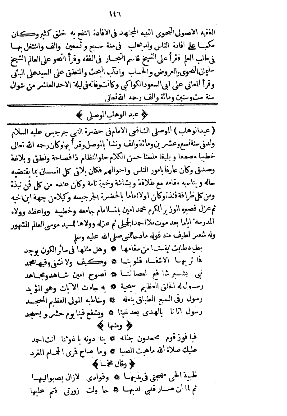 عبد الوهاب الموصلي الشافعي الامام في حضرة النبي جرجيس عليه السلام ولد في سنة تسع وعشرين ومائة وألف ونشأ بالموصل وقرأ بها وكان رحمه الله تعالى خطيباً مصفعاً وبليغاً ملسناً حسن الكلام حلو النظام ذا فصاحة ونطق وبلاغة وصدق وكان عارفاً بأمور الناس وأحوالهم فكان يلاقي كل انسان بما يقتضيه حاله ويناسبه مقامه مع طلاقة وبشاشة وخبرة تامة وكان عنده من كل فن نبذة ومن كل ظرافة فلذة وكان أولاً اماماً بالحضرة الجرجيسه وكيلاً من جهة ابن أخيه ثم عزل فصيره الوزير المكرم محمد أمين باشا امام جامعه وخطيبه وواعظه وولاه المدرسة أياماً بعد موت ملا أحمد الجميلي ثم عزله وولاها للسيد موسى العالم المشهور وله شعر لطيف منه قوله مادحاً للنبي صلى الله عليه وسلم