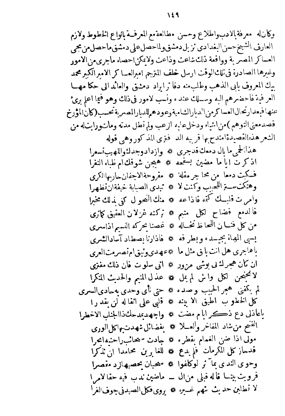 وكان له معرفة بالأدب واطلاع وحسن مطالعة مع المعرفة بأنواع الخطوط ولازم العارف الشيخ حسن البغدادي نزيل دمشق ولما حصل على دمشق ما حصل من مجى العساكر المصرية وواقعة ذلك شاعت وذاعت ولا يمكن احصاء ما جرى من الأمور وغيرها الصادرة في تلك الوقت أرسل خلف المترجم أمير العساكر الأمير الكبير محمد بيك المعروف بأبي الذهب وطلب منه دفاتر إيراد دمشق والعائد إلى حكامها العرفية فأحضرهم إليه وسلك عنده ونسب لأمور في ذلك وهو فيما أعلم برئ عنها فبعد ارتحال العساكر من الديار الشامية وعودهم للديار المصرية تحسب كان المؤرخ قصد معنى التوهم من أشياء ودخل عليه الرعب ولم تطل مدته ومات ورأيت له من الشعر هذه القصيدة امتدح بها قريبه الدفتري المذكور وهي قوله
