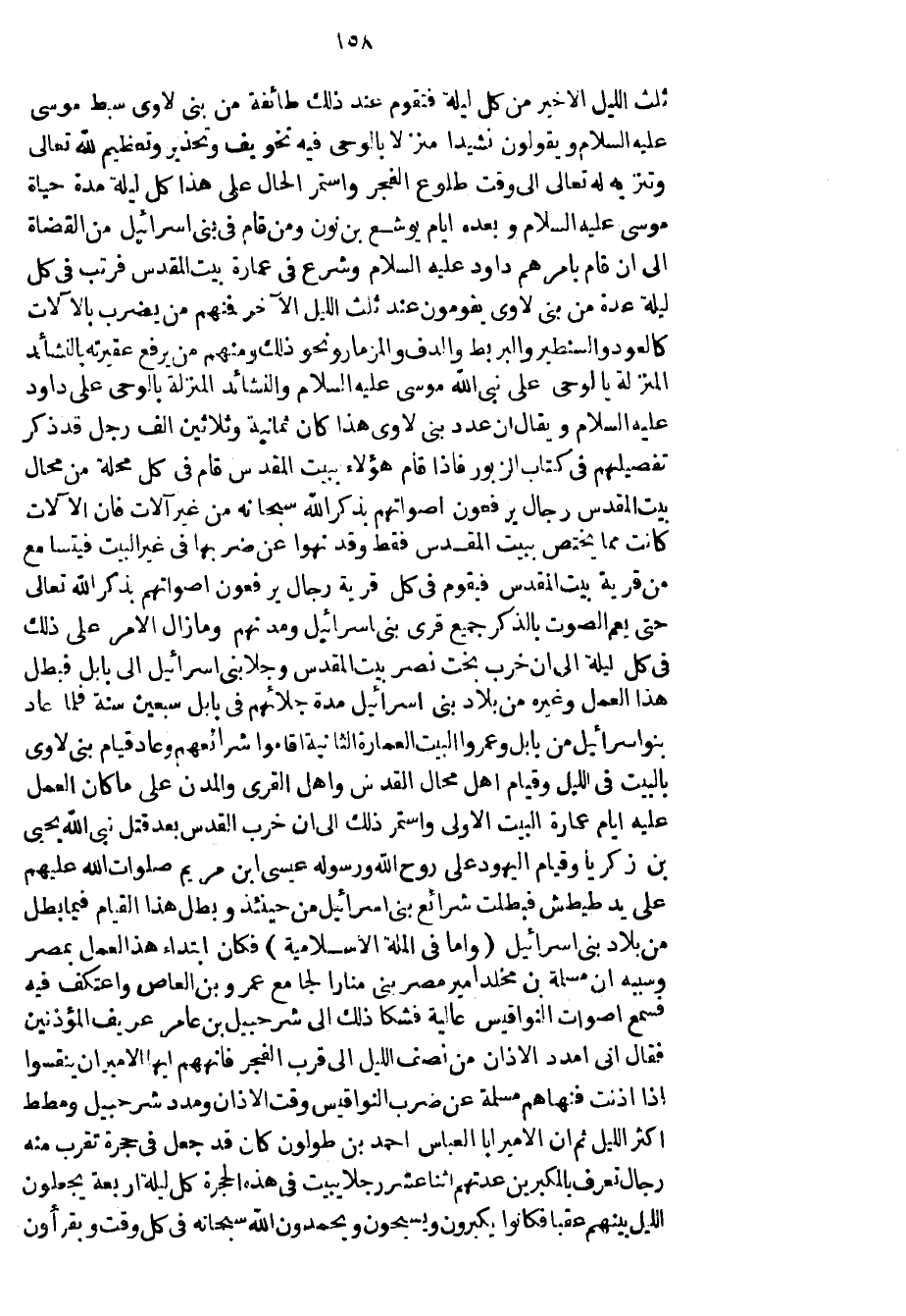 ثلث الليل الأخير من كل ليلة فتقوم عند ذلك طائفة من بني لاوي سبط موسى عليه السلام ويقولون نشيداً منزلاً بالوحي فيه تخويف وتحذير وتعظيم لله تعالى وتنزيه له تعالى إلى وقت طلوع الفجر واستمر الحال على هذا كل ليلة مدة حياة موسى عليه السلام وبعده أيام يوشع بن نون ومن قام في بني إسرائيل من القضاة إلى أن قام بأمرهم داود عليه السلام وشرع في عمارة بيت المقدس فرتب في كل ليلة عدة من بني لاوي يقومون عند ثلث الليل الآخر فمنهم من يضرب بالآلات كالعود والسنطير والبربط والدف والمزمار ونحو ذلك ومنهم من يرفع عقيرته بالنشائد المنزلة بالوحي على نبي الله موسى عليه السلام والنشائد المنزلة بالوحي على داود عليه السلام ويقال إن عدد بني لاوي هذا كان ثمانية وثلاثين ألف رجل قد ذكر تفصيلهم في كتاب الزبور فإذا قام هؤلاء ببيت المقدس قام في كل محلة من محال بيت المقدس رجال يرفعون أصواتهم بذكر الله سبحانه من غير آلات فإن الآلات كانت مما يختص ببيت المقدس فقط وقد نهوا عن ضربها في غير البيت فيتسامع من قرية بيت المقدس فيقوم في كل قرية رجال يرفعون أصواتهم بذكر الله تعالى حتى يعم الصوت بالذكر جميع قرى بني إسرائيل ومدنهم وما زال الأمر على ذلك في كل ليلة إلى أن خرب بخت نصر بيت المقدس وجلا بني إسرائيل إلى بابل فبطل هذا العمل وغيره من بلاد بني إسرائيل مدة جلائهم في بابل سبعين سنة فلما عاد بنو إسرائيل من بابل وعمروا البيت العمارة الثانية أقاموا شرائعهم وعاد قيام بني لاوي بالبيت في الليل وقيام أهل محال القدس وأهل القرى والمدن على ما كان العمل عليه أيام عمارة البيت الأولى واستمر ذلك إلى أن خرب القدس بعد قتل نبي الله يحيى بن زكريا وقيام اليهود على روح الله ورسوله عيسى ابن مريم صلوات الله عليهم على يد طيطش فبطلت شرائع بني إسرائيل من حينئذ وبطل هذا القيام فيما بطل من بلاد بني إسرائيل وأما في الملة الاسلامية فكان ابتداء هذا لعمل بمصر وسببه إن مسلمة بن مخلد أمير مصر بنى مناراً لجامع عمرو بن العاص واعتكف فيه فسمع أصوات النواقيس عالية فشكا ذلك إلى شرحبيل بن عامر عريف المؤذنين فقال إني أمدد الآذان من نصف الليل إلى قرب الفجر فإنههم أيها الأمير أن ينقسوا إذا أذنت فنهاهم مسلمة عن ضرب النواقيس وقت الآذان ومدد شرحبيل ومطط أكثر الليل ثم إن الأمير أبا العباس أحمد بن طولون كان قد جعل في حجرة تقرب منه رجال تعرف بالمكبرين عدتهم اثنا عشر رجلاً يبيت في هذه الحجرة كل ليلة أربعة يجعلون الليل بينهم عقباً فكانوا يكبرون ويسبحون ويحمدون الله سبحانه في كل وقت ويقرأون