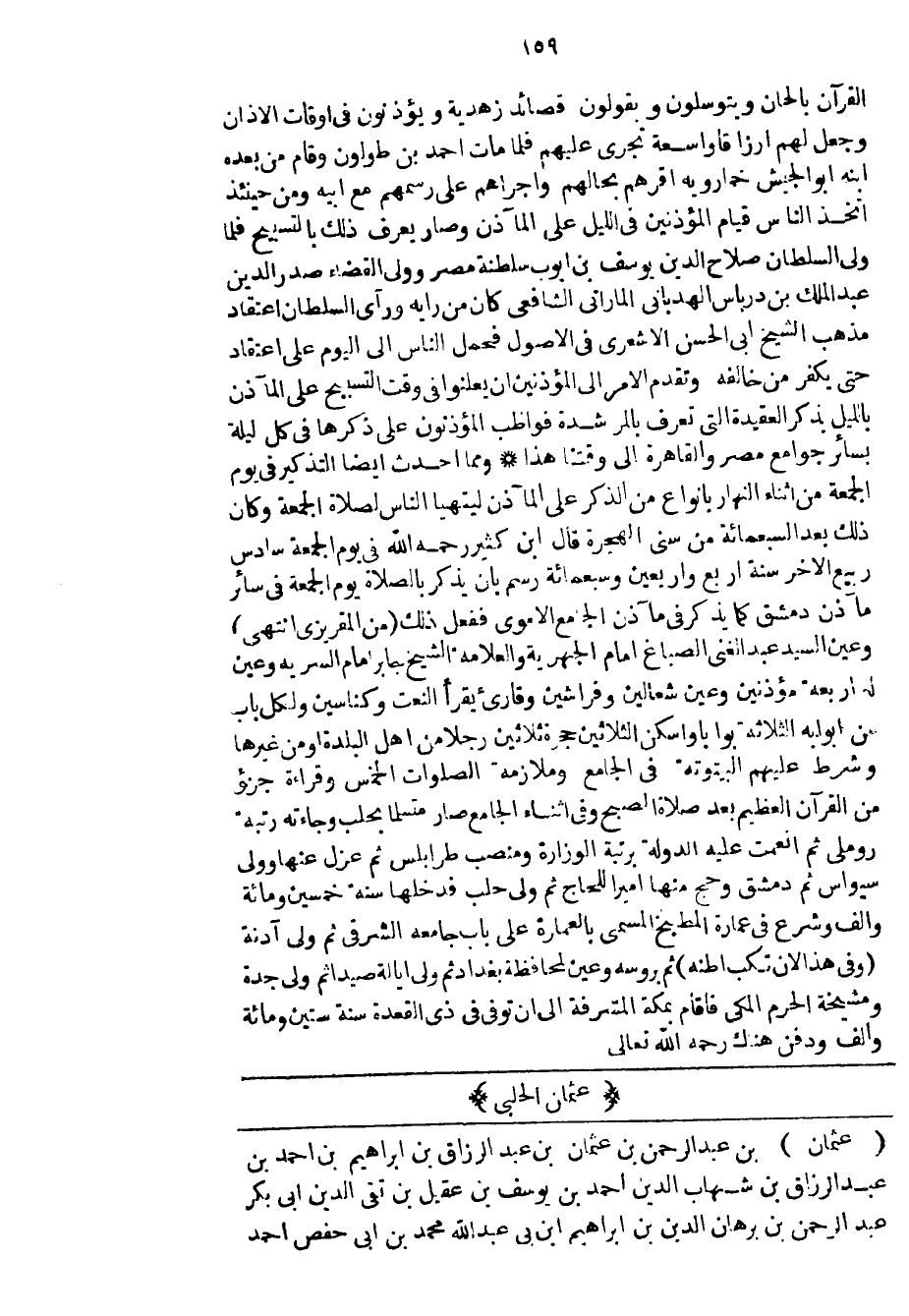 ولي السلطان صلاح الدين يوسف بن أيوب سلطنة مصر وولي القضاء صدر الدين عبد الملك بن درباس الهدباني الماراني الشافعي كان من رأيه ورأي السلطان اعتقاد مذهب الشيخ أبي الحسن الأشعري في الأصول فحمل الناس إلى اليوم على اعتقاد حتى يكفر من خالفه وتقدم الأمر إلى المؤذنين أن يعلنوا في وقت التسبيح على المآذن بالليل يذكر العقيدة التي تعرف بالمرشدة فواظب المؤذنون على ذكرها في كل ليلة بسائر جوامع مصر والقاهرة إلى وقتنا هذا ومما أحدث أيضاً التذكير في يوم الجمعة من أثناء النهار بأنواع من الذكر على المآذن ليتهيأ الناس لصلاة الجمعة وكان ذلك بعد السبعمائة من سني الهجرة. لي السلطان صلاح الدين يوسف بن أيوب سلطنة مصر وولي القضاء صدر الدين عبد الملك بن درباس الهدباني الماراني الشافعي كان من رأيه ورأي السلطان اعتقاد مذهب الشيخ أبي الحسن الأشعري في الأصول فحمل الناس إلى اليوم على اعتقاد حتى يكفر من خالفه وتقدم الأمر إلى المؤذنين أن يعلنوا في وقت التسبيح على المآذن بالليل يذكر العقيدة التي تعرف بالمرشدة فواظب المؤذنون على ذكرها في كل ليلة بسائر جوامع مصر والقاهرة إلى وقتنا هذا ومما أحدث أيضاً التذكير في يوم الجمعة من أثناء النهار بأنواع من الذكر على المآذن ليتهيأ الناس لصلاة الجمعة وكان ذلك بعد السبعمائة من سني الهجرة.
