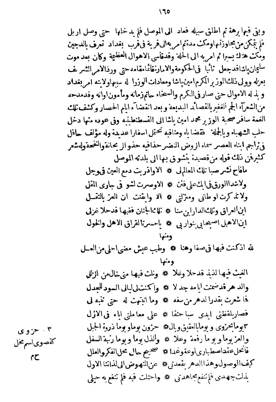 وبقي فيها برهة ثم أطلق سبيله فعاد إلى الموصل فلم يدخلها حتى وصل أربل فلم يتمكن من مجاوزتها ومكث مدة ثم أمر به إلى قرية في قرب بغداد تعرف بالدجين ومكث هناك يسيراً ثم أمر به إلى الحلة وقد قاسى الأهوال العظيمة وكان بعد موت سليمان باشا قد جعل نائباً في الحكومة والامارة قائماً مقامه حتى ورد الأمر الشريف بعزله وولي ذلك الوزير المكرم أمين باشا ومعادات الوزرا له سببها ولايته أمر بغداد وبذله الأموال حتى صار في الكرم والسخاء حاتم زمانه ومأمون أوانه وقد مدحه من الشعراء الجم الغفير بالقصائد البديعة وبعد انقضاء أيام الحصار وكشف تلك الغمة سافر صحبة الوزير محمد أمين باشا إلى القسطنطينية وفي عوده منها دخل حلب الشهباء وبالجملة فقضاياه ومناقبه تحتمل أسفاراً عديدة وله مؤلف حافل في تراجم أبناء العصر سماه الروض النضر حذافيه حذو الريحانة والنفحة وله شعر كثير فمن ذلك قوله من قصيدة يتشوق بها إلى بلدته الموصل
