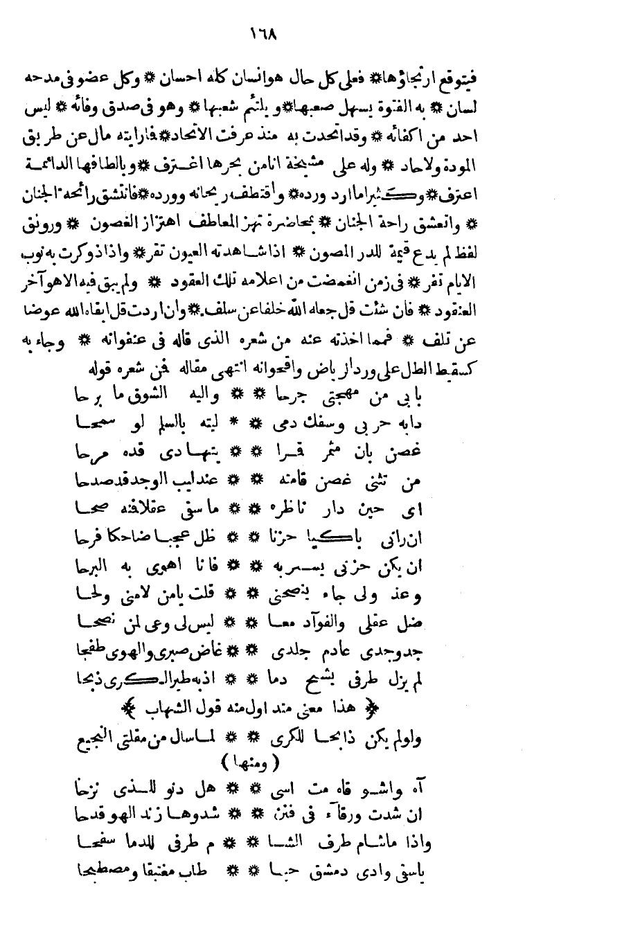 فيتوقع ارتجاؤها فعلى كل حال هو إنسان كل إحسان وكل عضو في مدحه لسان به الفتوة يسهل صعبها ويلتئم شعبها وهو في صدق وفائه ليس أحد من أكفائه وقد اتحدت به منذ عرفت الاتحاد فما رأيته مال عن طريق المودة ولاحاد وله على مشيخة أنا من بحرها اغترف وبألطافها الدائمة اعترف وكثيراً ما أرد ورده واقتطف ريحانه وورده فانتشق رائحة الجنان وأتعشق راحة الجنان بمحاضرة تهز المعاطف اهتزاز الغصون ورونق لفظ لم يدع قيمة للدر المصون إذا شاهدته العيون تقر وإذا ذوكرت به نوب الأيام تفر في زمن انغمضت من أعلامه تلك العقود ولم يبق فيه إلا هو آخر العنقود فإن شئت قل جعله الله خلفاً عن سلف وإن أردت قل أبقاه الله عوضاً عن تلف فمما أخذته عنه من شعره الذي قاله في عنفوانه وجاء به كسقيط الطل على ورد الرياض واقحوانه انتهى مقاله فمن شعره قوله