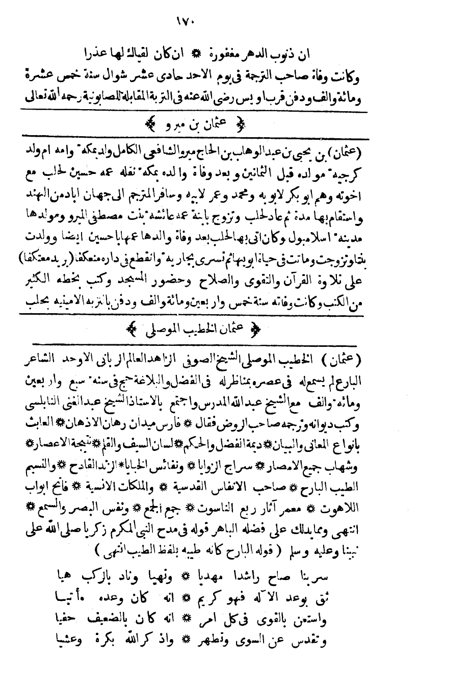 عثمان الخطيب الموصلي الشيخ الصوفي الزاهد العالم الرباني الأوحد الشاعر البارع لم يسمع له في عصره بمناظر له في الفضل والبلاغة حج في سنة سبع وأربعين ومائة وألف مع الشيخ عبد الله المدرس واجتمع بالأستاذ الشيخ عبد الغني النابلسي وكتب ديوانه وترجمه صاحب الروض فقال فارس ميدان رهان الأذهان العابث بأنواع المعاني والبيان ديمة الفضل والحكم لسان السيف والقلم نتيجة الأعصار وشهاب جميع الأمصار سراج الزوايا ونفائس الخبايا الزند القادح والنسيم الطيب البارح صاحب الأنفاس القدسية والملكات الأنسية فاتح أبواب اللاهوت معمر آثار ربع الناسوت جمع الجمع ونفس البصر والسمع انتهى ومما يدلك على فضله الباهر قوله في مدح النبي المكرم زكريا صلى الله على نبينا وعليه وسلم قوله البارح كأنه طيبه بلفظ الطيب انتهى