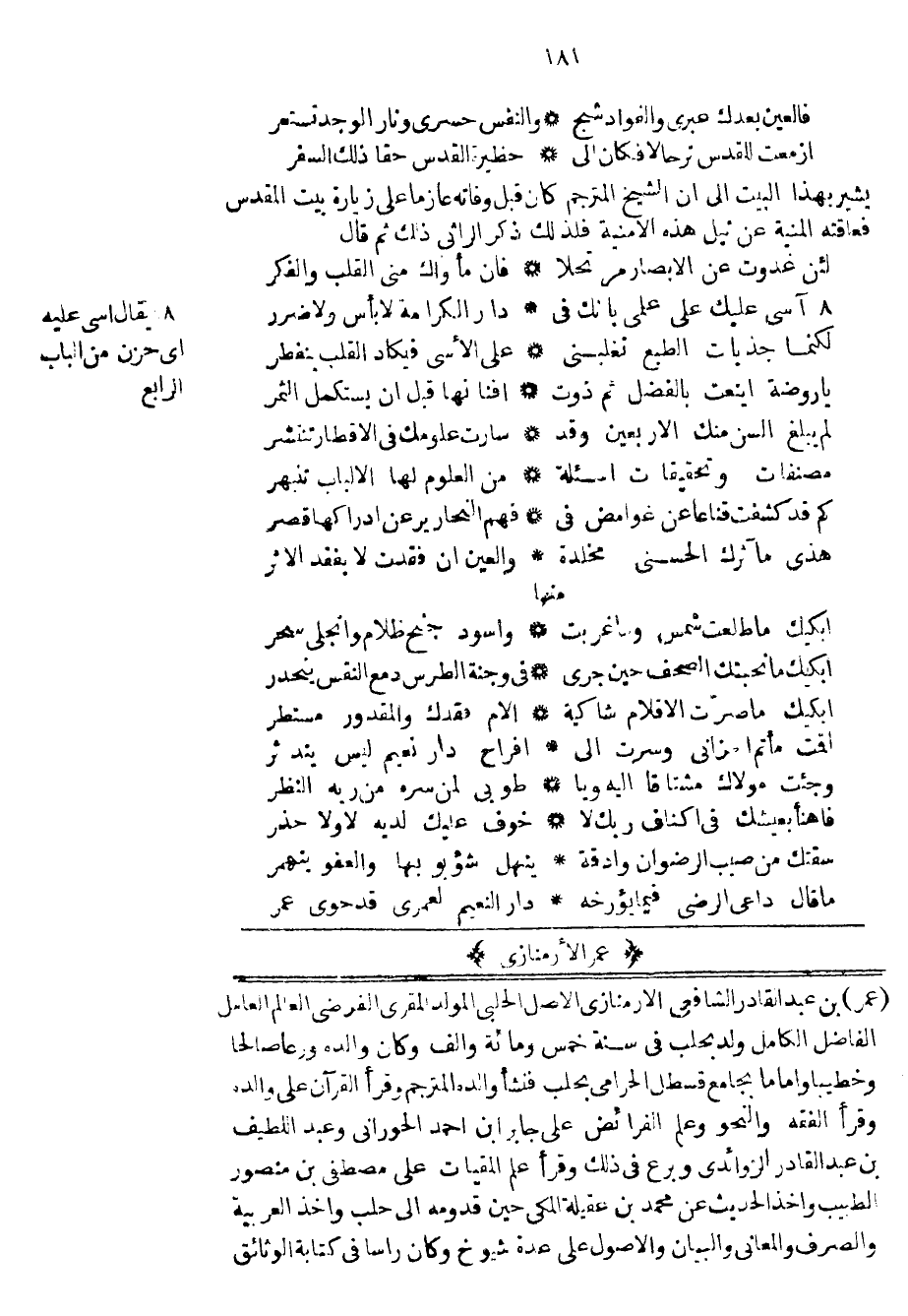 عمر بن عبد القادر الشافعي الأرمنازي الأصل الحلبي المولد المقري الفرضي العالم العامل الفاضل الكامل ولد بحلب في سنة خمس ومائة وألف وكان والده ورعاً صالحاً وخطيباً واماماً بجامع قسطل الحرامي بحلب فنشأ والده المترجم وقرأ القرآن على والده وقرأ الفقه والنحو وعلم الفرائض علي جابر ابن أحمد الحوراني وعبد اللطيف بن عبد القادر الزوائدي وبرع في ذلك وقرأ علم المقيات علي مصطفى بن منصور الطبيب وأخذ الحديث عن محمد بن عقيلة المكي حين قدومه إلى حلب وأخذ العربية والصرف والمعاني والبيان والأصول على عدة شيوخ وكان رأساً في كتابة الوثائق