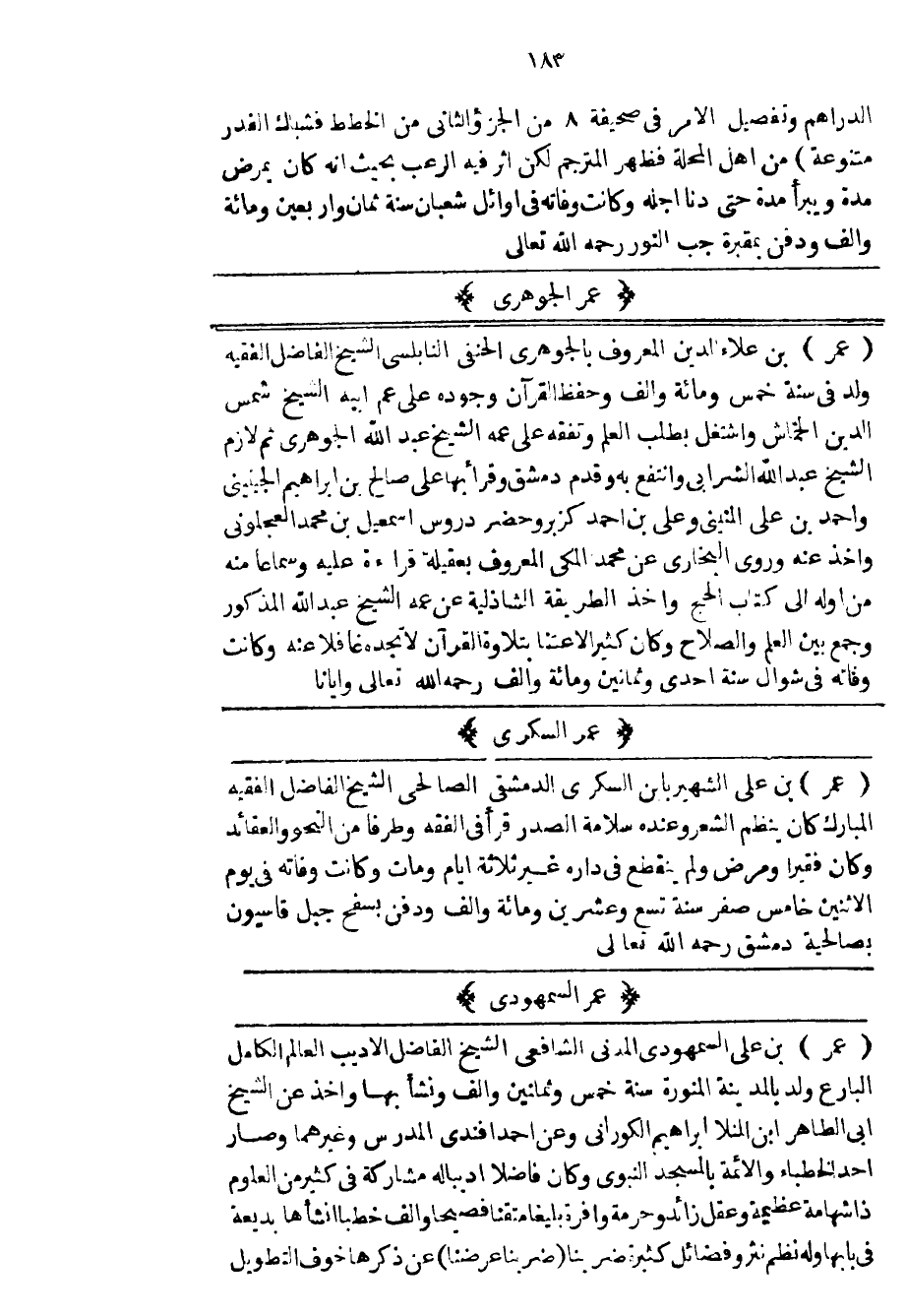 عمر بن علاء الدين المعروف بالجوهري الحنفي النابلسي الشيخ الفاضل الفقيه ولد في سنة خمس ومائة وألف وحفظ القرآن وجوده على عم أبيه الشيخ شمس الدين الخماش واشتغل بطلب العلم وتفقه على عمه الشيخ عبد الله الجوهري ثم لازم الشيخ عبد الله الشرابي وانتفع به وقدم دمشق وقرأ بها علي صالح بن إبراهيم الجينيني وأحمد بن علي المنيني وعلي بن أحمد كزبر وحضر دروس إسمعيل بن محمد العجلوني وأخذ عنه وروى البخاري عن محمد المكي المعروف بعقيلة قراءة عليه وسماعاً منه من أوله إلى كتاب الحج وأخذ الطريقة الشاذلية عن عمه الشيخ عبد الله المذكور وجمع بين العلم والصلاح وكان كثير الأعتنا بتلاوة القرآن لا تجده غافلاً عنه وكانت وفاته في شوال سنة احدى وثمانين ومائة وألف رحمه الله تعالى وإيانا.