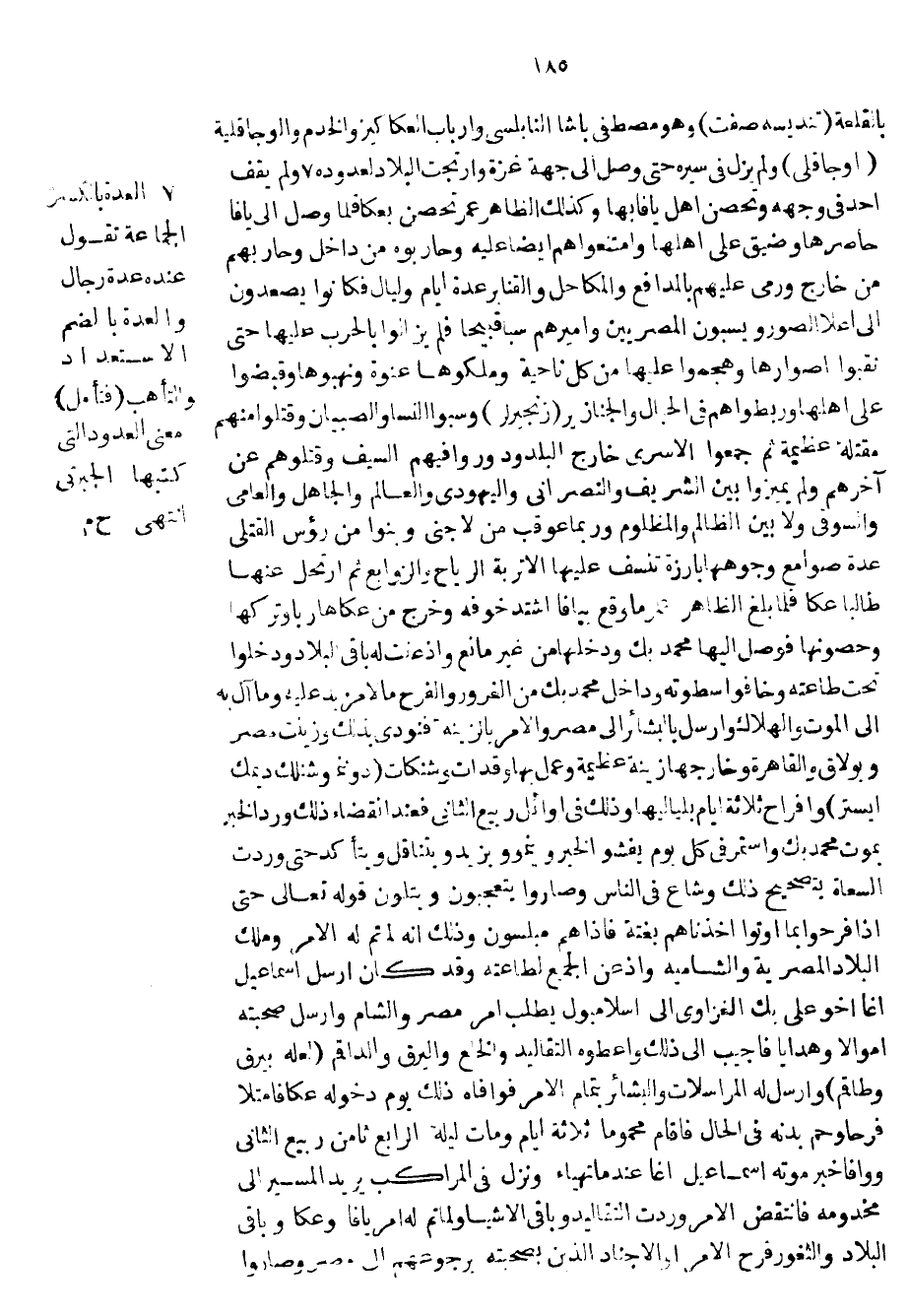 بالقلعة تنديسه صفت وهو مصطفى باشا النابلسي وأرباب العكاكيز والخدم والوجاقلية أوجاقلي ولم يزل في سيره حتى وصل إلى جهة غزة وارتجت البلاد لعدوده ولم يقف أحد في وجهه وتحصن أهل يافا بها وكذلك الظاهر عمر تحصن بعكا فلما وصل إلى يافا حاصرها وضيق على أهلها وامتنعوا هم أيضاً عليه وحاربوه من داخل وحاربهم من خارج ورمى عليهم بالمدافع والمكاحل والقنابر عدة أيام وليال فكانوا يصعدون إلى أعلا الصور ويسبون المصريين وأميرهم سباً قبيحاً فلم يزالوا بالحرب عليها حتى نقبوا أصوارها وهجموا عليها من كل ناحية وملكوها عنوة ونهبوها وقبضوا على أهلها وربطوهم في الحبال والجنازير زنجيرلر وسبوا النسا والصبيان وقتلوا منهم مقتلة عظيمة ثم جمعوا الأسرى خارج البلد ودوروا فيهم السيف وقتلوهم عن آخرهم ولم يميزوا بين الشريف والنصراني واليهودي والعالم والجاهل والعامي والسوقي ولا بين الظالم والمظلوم وربما عوقب من لا جنى وبنوا من رؤس القتلى عدة صوامع وجوهها بارزة تنسف عليها الأتربة الرياح والزوابع ثم ارتحل عنها طالباً عكا فلما بلغ الظاهر عمر ما وقع بيافا اشتد خوفه وخرج من عكا هارباً وتركها وحصونها فوصل إليها محمد بك ودخلها من غير مانع وأذعنت له باقي البلاد ودخلوا تحت طاعته وخافوا سطوته وداخل محمد بك من الغرور والفرح مالاً مزيد عليه وما آل به إلى الموت والهلاك وأرسل بالبشائر إلى مصر والأمر بالزينة فنودي بذلك وزينت مصر وبولاق والقاهرة وخارجها زينة عظيمة وعمل بها وقدات وشنكات دوننموشنلك ديمك ايستر وأفراح ثلاثة أيام بلياليها وذلك في أوائل ربيع الثاني فعند انقضاء ذلك ورد الخبر بموت محمد بك واستمر في كل يوم يفشو الخبر وينمو ويزيد ويتناقل ويتأكد حتى وردت السعاة بتصحيح ذلك وشاع في الناس وصاروا يتعجبون ويتلون قوله تعالى حتى إذا فرحوا بما أوتوا أخذناهم بغتة فأذاهم مبلسون وذلك إنه لما تم له الأمر وملك البلاد المصرية والشامية وأذعن الجميع لطاعته وقد كان أرسل إسماعيل أغا أخو علي بك الغزاوي إلى اسلامبول يطلب أمر مصر والشام وأرسل صحبته أموالاً وهدايا فأجيب إلى ذلك