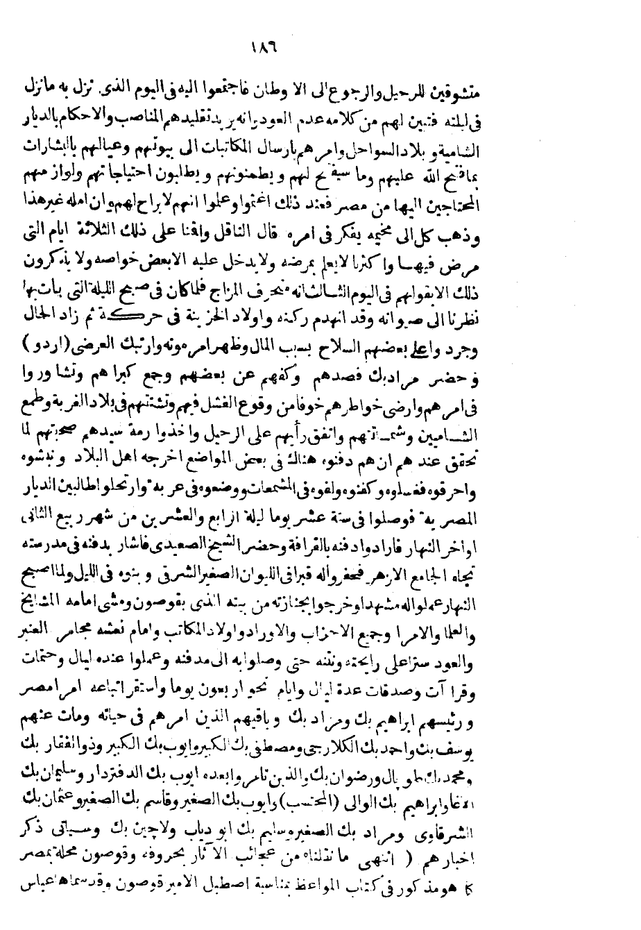متشوقين للرحيل والرجوع إلى الأوطان فاجتمعوا إليه في اليوم الذي نزل به ما نزل في ليلته فتبين لهم من كلامه عدم العود وإنه يريد تقليدهم المناصب والأحكام بالديار الشامية وبلاد السواحل وأمرهم بإرسال المكاتبات إلى بيوتهم وعيالهم بالبشارات بما فتح الله عليهم وما سيفتح لهم ويطمنونهم ويطلبون احتياجاتهم ولوازمهم المحتاجين إليها من مصر فعند ذلك اغتموا وعلموا أنهم لا براح لهم وإن أمله غير هذا وذهب كل إلى مخيمه يفكر في أمره قال الناقل وأقمنا على ذلك الثلاثة أيام التي مرض فيها وأكثر لا يعلم بمرضه ولا يدخل عليه إلا بعض خواصه ولا يذكرون ذلك إلا بقولهم في اليوم الثالث إنه منحرف المزاج فلما كان في صبح الليلة التي بات بها نظرنا إلى صيوانه وقد انهدم ركنه وأولاد الخزينة في حركة ثم زاد الحال وجرد وأعلى بعضهم السلاح بسبب المال وظهر أمر موته وارتبك العرضي أردو وحضر مراد بك فصدهم وكفهم عن بعضهم وجمع كبراهم وتشاوروا في أمرهم وأرضى خواطرهم خوفاً من وقوع الفشل فيهم وتشتتهم في بلاد الغربة وطمع الشاميين وشماتتهم واتفق رأيهم على الرحيل وأخذوا رمة سيدهم صحبتهم لما تحقق عندهم إن هم دفنوه هناك في بعض المواضع أخرجه أهل البلاد ونبشوه وأحرقوه فغسلوه وكفنوه ولفوه في المشمعات ووضعوه في عربة وارتحلوا طالبين الديار المصرية فوصلوا في ستة عشر يوماً ليلة الرابع والعشرين من شهر ربيع الثاني أواخر النهار فأرادوا دفنه بالقرافة وحضر الشيخ الصعيدي فأشار بدفنه في مدرسته تجاه الجامع الأزهر فحفروا له قبراً في الليوان الصغير الشرقي وبنوه في الليل ولما أصبح النهار عملوا له مشهداً وخرجوا بجنازته من بيته الذي بقوصون ومشى أمامه المشايخ والعلما والأمرا وجميع الأحزاب والأوراد وأولاد المكاتب وأمام نعشه مجامر العنبر والعود ستراً على رايحته ونتنه حتى وصلوا به إلى مدفنه وعملوا عنده ليال وحتمات وقراآت وصدقات عدة ليال وأيام نحو أربعون يوماً واستقر أتباعه أمرا مصر ورئيسهم إبراهيم بك ومراد بك وباقيهم الذين أمرهم في حياته ومات عنهم يوسف بك وأحمد بك الكلارجي ومصطفى بك الكبير وأيوب بك الكبير وذو الفقار بك ومحمد بك طوبال ورضوان بك والذين تأمروا بعده أيوب بك الدفتردار وسليمان بك الأغا وإبراهيم بك الوالي المحتسب وأيوب بك الصغير وقاسم بك الصغير وعثمان بك الشرقاوي ومراد بك الصغير وسليم بك أبو ديار ولاجين بك وسيأتي ذكر أخبارهم انتهى ما نقلناه من عجائب الآثار بحروفه وقوصون محلة بمصر كما هو مذكور في كتاب المواعظ بمناسبة اصطبل الأمير قوصون وقد سماها عباس
