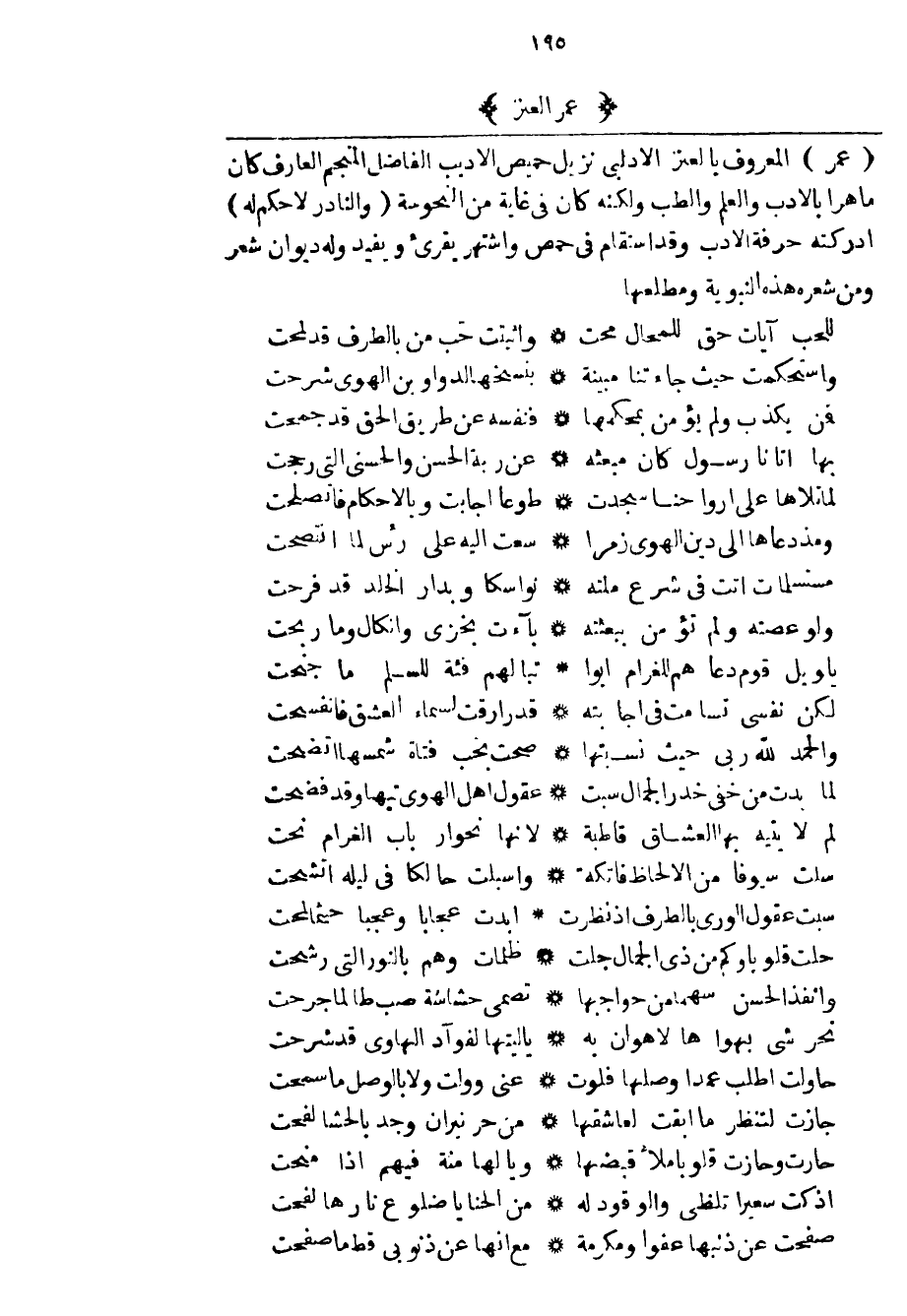 عمر المعروف بالعنز الأدلبي نزيل حميص الأديب الفاضل المنجم العارف كان ماهراً بالأدب والعلم والطب ولكنه كان في غاية من لنحوسة والنادر لا حكم له أدركته حرفة الأدب وقد استقام في حمص واشتهر يقرئ ويفيد وله ديوان شعر ومن شعره هذه النبوية ومطلعها