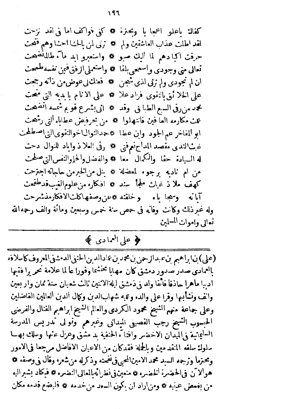 علي بن إبراهيم بن عبد الرحمن بن محمد بن عماد الدين الحنفي الدمشقي المعروف كأسلافه بالعمادي صدر صدور دمشق كان مهاباً محتشماً وقوراً عالماً علامة نحريراً فقيهاً أديباً ماهراً حاذقاً فائقاً ولد في دمشق ليلة الأثنين ثالث شعبان سنة ثمان وأربعين وألف ونشأ بها وقرأ على والده وعميه شهاب الدين وكمال الدين العالمين الفاضلين وعلى جماعة منهم الشيخ محمود الكردي والعالم الشيخ إبراهيم الفتال والفرضي الحيسوب الشيخ رجب القصيفي الميداني وغيرهم وتولى تدريس المدرسة السليمانية في الميدان الأخضر وافتاء الحنفية بدمشق وعزل عنها وسلك بها سلوك سلفه المتقدمين وبالجملة فقد كان من الأعيان الأفاضل مرجعاً في الأمور ومحترماً ترجمه السيد محمد الأمين المحبي في نفحته وذكر له من شعره وقال في وصفه هو الآن في الحضرة الخضرة متعين في نظرائه بالمعالي النضرة فيكاد يشير إليه من يغمض عينيه ومن أرد أن يكون السعد من خدمه فليضع قدمه مكان