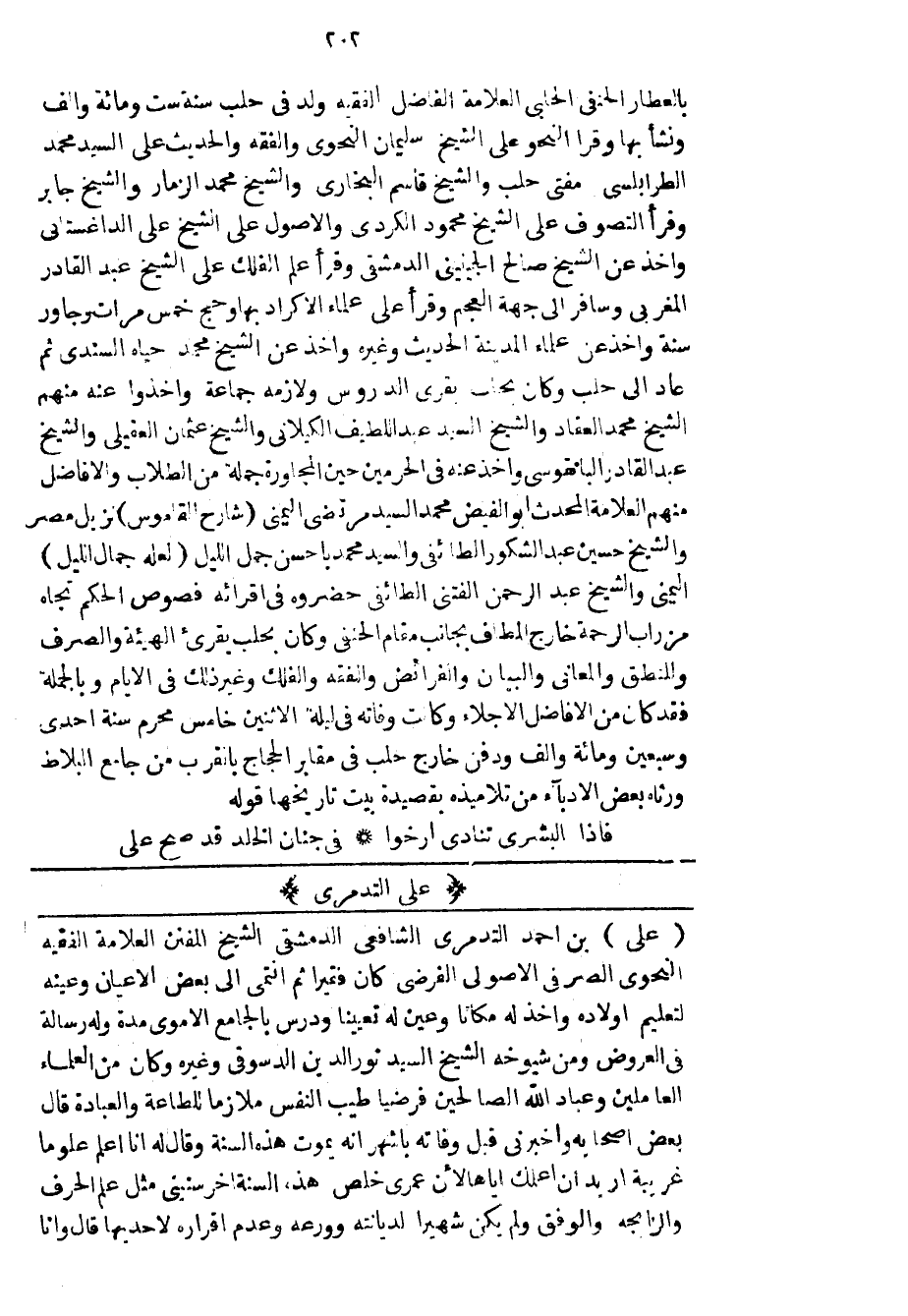 علي بن أحمد التدمري الشافعي الدمشقي الشيخ المفنن العلامة الفقيه النحوي الصرفي الأصولي الفرضي كان فقيراً ثم انتمى إلى بعض الأعيان وعينه لتعليم أولاده وأخذ له مكاناً وعين له تعييناً ودرس بالجامع الأموي مدة وله رسالة في العروض ومن شيوخه الشيخ السيد نور الدين الدسوقي وغيره وكان من العلماء العاملين وعباد الله الصالحين فرضياً طيب النفس ملازماً للطاعة والعبادة قال بعض أصحابه وأخبرني قبل وفاته بأشهر إنه يموت هذه السنة وقال له أنا أعلم علوماً غريبة أريد ان أعلمك إياها لأن عمري خلص هذه السنة أخر سنيني مثل علم الحرف والزابحة والوفق ولم يكن شهيراً لديانته وورعه وعدم إقراره لا حديها قال وأنا