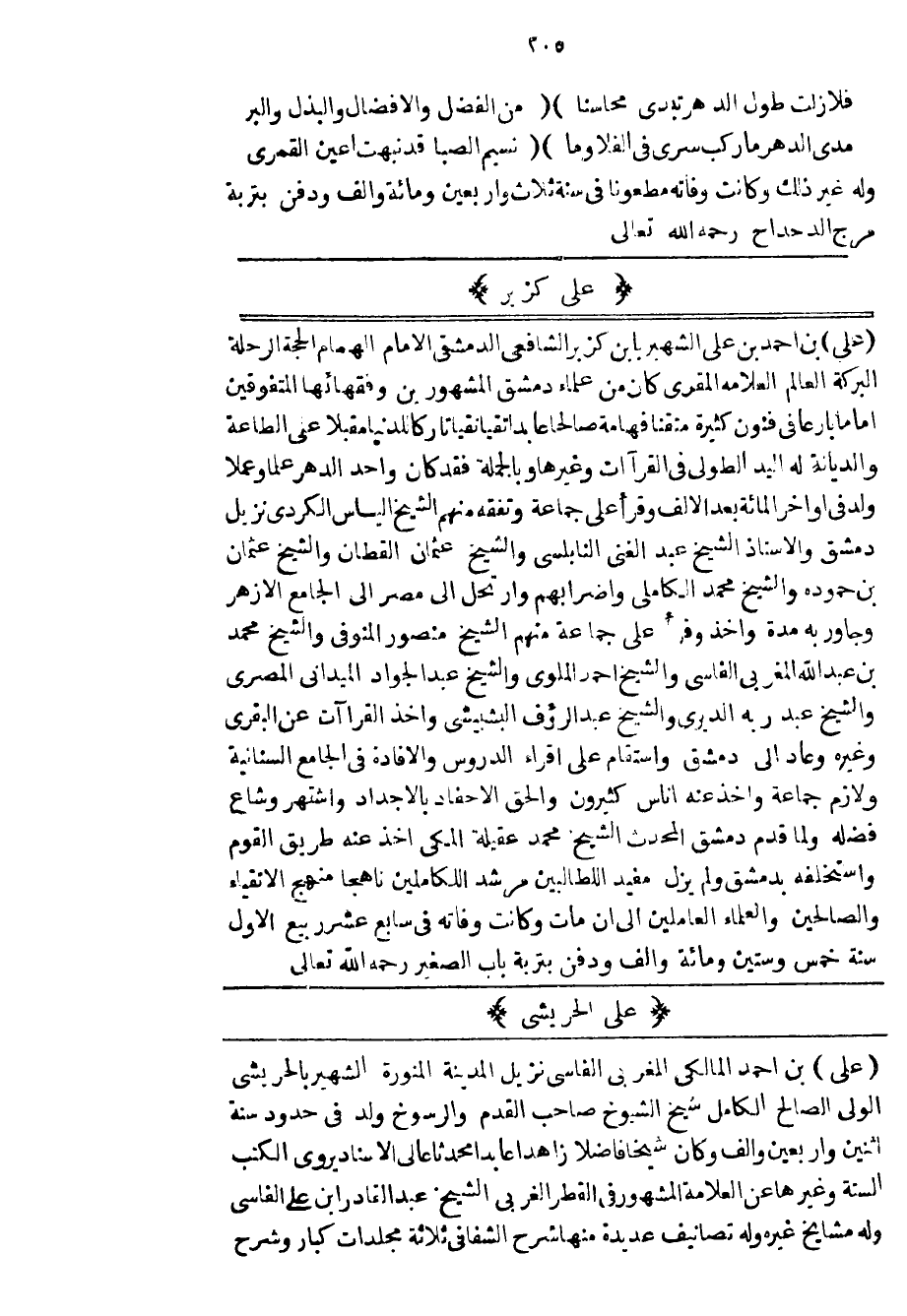 علي بن أحمد بن علي الشهير بابن كزبر الشافعي الدمشقي الامام الهمام الحجة الرحلة البركة العالم العلامة المقري كان من علماء دمشق المشهورين وفقهائها المتفوقين اماماً بارعاً في فنون كثيرة متقناً فهامة صالحاً عابداً تقياً تاركاً للدنيا مقبلاً على الطاعة والديانة له اليد الطولى في القراآت وغيرها وبالجملة فقد كان واحد الدهر علماً وعملاً ولد في أواخر المائة بعد الألف وقرأ على جماعة وتفقه منهم الشيخ الياس الكردي نزيل دمشق والأستاذ الشيخ عبد الغني النابلسي والشيخ عثمان القطان والشيخ عثمان بن حموده والشيخ محمد الكاملي وأضرابهم وارتحل إلى مصر إلى الجامع الأزهر وجاور به مدة وأخذ وقرأ على جماعة منهم الشيخ منصور المنوفي والشيخ محمد بن عبد الله المغربي الفاسي والشيخ أحمد الملوي والشيخ عبد الجواد الميداني المصري والشيخ عبد ربه الديري والشيخ عبد الرؤف البشبيشي وأخذ القراآت عن البقري وغيره وعاد إلى دمشق واستقام على إقراء الدروس والافادة في الجامع السنانية ولازم جماعة وأخذ عنه أناس كثيرون وألحق الأحفاد بالأجداد واشتهر وشاع فضله ولما قدم دمشق المحدث الشيخ محمد عقيلة المكي أخذ عنه طريق القوم واستخلفه بدمشق ولم يزل مفيد الطالبين مرشد الكاملين ناهجاً منهج الأتقياء والصالحين والعلماء العاملين إلى أن مات وكانت وفاته في سابع عشر ربيع الأول سنة خمس وستين ومائة وألف ودفن بتربة باب الصغير رحمه الله تعالى.