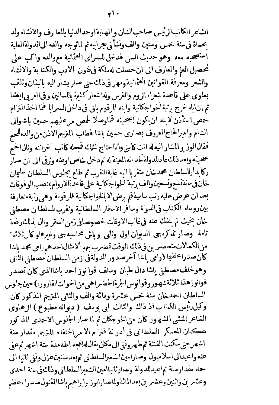 الشاعر الكاتب الرئيس صاحب الشأن والمهابة أوحد الدنيا بالمعارف والانشاء ولد بحماة في سنة خمس وستين وألف ونشأ في حجر أبيه ثم لما توجه والده إلى الدولة العلية استصحبه معه وهو حديث السن فدخل للسراي العثمانية مع والده وأكب على تحصيل العلم والمعارف إلى أن حصلت له مكلة في فنون الأدب والكتابة والانشاء والشعر ومعرفة القوانين العثمانية ومهر في ذلك حتى صار يشار إليه بالبنان وتلقب بعلوي على قاعدة شعراء الروم والفرس وله أشعار كثيرة باللسانين وفي العربي أيضاً ثم إن أباه خرج برتبة الخواجكانية وابنه المرقوم باق في داخل السرايا فلما أخذ التزام حمص استأذن لأبنه أن يكون بصحبته فلما وصلا لحمص مر عليهم حسين باشا والي الشام وأمير الحاج المعروف بصاري حسين باشا فطلب المترجم الأذن من والده للحج فقال الوزير المشار إليه له أنت كابني وأنا أحتاج لمثلك فجعله كاتب خزانته ونال الحج صحبته وبعد ذلك عاد للدولة لخدمته المعينة له ثم دخل خاص أوضه وترقى إلى أن صار ركا بدار للسلطان محمد خان متقرباً إليه غاية التقرب ثم طلع بجلوس السلطان سليمان خان في سنة تسع وتسعين وألف برتبة الخواجكانية على قاعدة الأروام بمنصب الوقوفات بعد أن عرض عليه رتب سامية فلم يرض إلا بالخواجكانية المرقومة وهي رتبة متعارفة بين رؤساء الكتاب في الدولة وسافر الأسفار السلطانية وتقرب للسلطان مصطفى خان بحيث لم ينفك عنه في غالب الأوقات خصوصاً في زمن السفر ونال بذلك رفعة تامة وصار تذكره جي الديوان أول وثاني وباش محاسبه جي وغيرها وكان ثلاثة من الكمالات متعاصرين في ذلك الوقت تضرب بهم الأمثال أحدهم رامي محمد باشا كان صدراً عظيماً رامي باشا آخر صدور الدولة في زمن السلطان مصطفى الثاني وهو خلف مصطفى باشا دال طبان وسلف قوانوز أحمد باشا الذي كان تصدر قوانوز هذا ثلاثة شهور وقوانوس الجرة الخضر أهي من أخوات القاروره حين جلوس السلطان أحمد خان سنة خمس عشرة ومائة وألف والثاني المترجم المذكور كان وكيل رئيس الكتاب إذ ذاك والثالث أبي يوسف ديوانه مطبوع الرهاوي الشاعر المنشي المشهور كان من الخوجكان ثم لما صار الجلوس الأحمدي المذكور كان المعسكر السلطاني في أدرنة فلزم الأمر اختفاء المترجم مقدار ستة أشهر حتى سكنت الفتنة ثم ظهر ونفي إلى مكان يقال له بعجه أطه مدة ستة أشهر ثم عفي عنه وأعيد إلى اسلامبول وصار أمين الشعير السلطاني ثم بعد سنتين عزل ونفي ثانياً إلى حماه مقدار سنة ثم أعيد للدولة وصار ثانياً أمين الشعير السلطاني وذلك في سنة احدى وعشرين واثنين وعشرين بعد المائة ولما صار الوزير إبراهيم باشا المقتول صدراً أعظم
