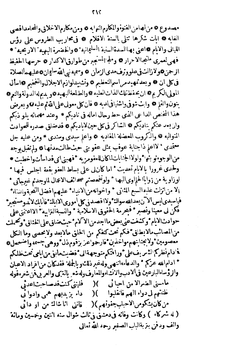 مصدوع من لها من الفنوة والمكارم النهايه ومن مكارم الأخلاق والمحامد أقصى الغاية آيات شكرها تتلى بألسنة الأقلام في محاريب الطروس على رؤس الليالي والأيام أعنى بها السدة السنية السليمانية والخضرة البهية الأريحية فهي لعمري ملتجأ الأحرار وملجأ المستجير من طوارق الأكدار حرسها الحفيظ الرحمن ولا زالت في علو وترف مدى الزمان وسميه نبي الله سليمان عليهما الصلاة في كل آن وبعد تمهيد مراسم التعظيم وتشييد لوازم الأجلال والتفخيم أسأل المولى الكريم أن يحفظ تلك الذات العلية والطلعة البهية ويديم له الدولة والنعم بنون والقلم وأبث شوقي واشتياقي لديه فإن كل معولي على الله ثم عليه ويعرض هذا المخلص الداعي الذي حط رحال أماله في ناديكم وعند مهماته يلوذ بكم وأن بعد عنكم يناديكم الشاكر في كل حين لأياديكم قد ضاق صدره للحوادث المتوالية والكروب المعضلة المفادية وأعلم سيدي وسندي ومن عليه جل معتمدي لا أعلم ذا جناية عوقب بمثل عقوبتي حيث طالت مدتها ولم تقبل بوجه من الوجوه توبتها ولولا الجنايات لما كان للعفو مزيه فهبني أني قد أسأت وأخطيت ولحدي غروراً بالأيام تعديت أما كان لي على بساط العفو بقعة أجلس فيها أو زاوية من زوايا الحلم أوى ألبها ولم تفحصتم صحائف الأعمال لما وجدتم غير جاني إلا من أنزلت عليه السبع المثاني وإخوانه من الأنبياء عليهم أفضل التحية والثناء فيا سيدي ليس الآن بعد الله سواك ولا أقصد في كل أموري إلا إياك فأنا بك لائد ومستجير فكن لي معيناً ونصير فبحرمة الحقوق الاسلامية والنسبة الترابية ألا أعتني على حوادث الأيام وكشفت عني بعض ما أجد من الآلام حيث ضاق علي الخناق وتحملت من المصائب ما لا يطاق فكم تحت كنفكم من الخلق ما لا يعد ولا يحصى وما الكل معصومين ولا بجنابتهم وأخذين فارحموا عزيز قوم ذل ووهى جسمه واضمحل فما دام نظركم الشريف على ورأفتكم متوجهة إلي قضيت ما بقي من أيامي تحت ظلكم أدام الله عزكم والدعاء انتهى وله غير ذلك وبالجملة فقد كان من أفراد الأعيان والرؤساء البارعين في الأدب والانشاء والمعارف وله شعر بالتركي والعربي فمن شعره قوله