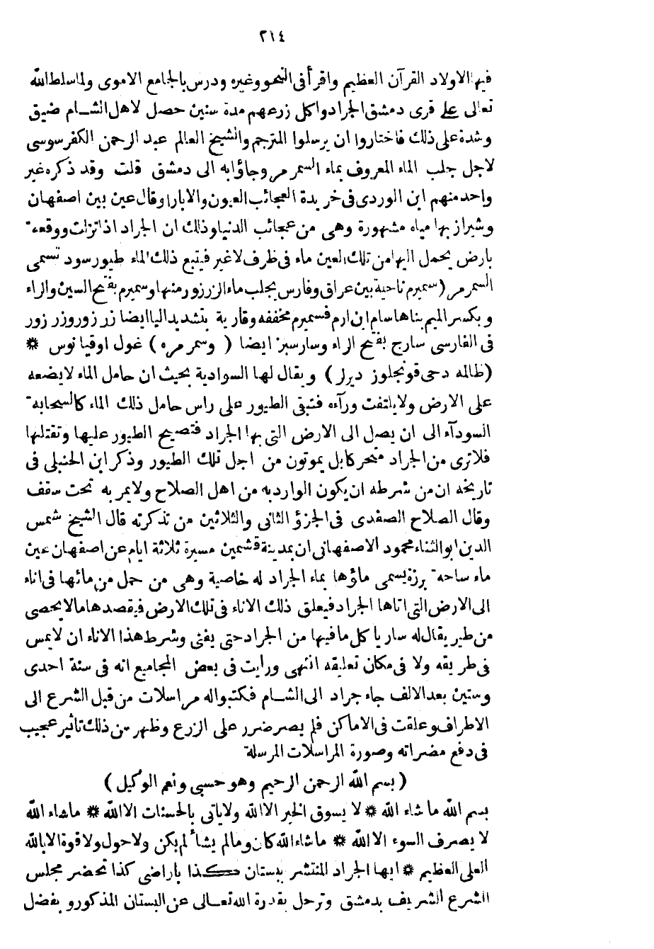 فيها الأولاد القرآن العظيم وأقرأ في النحو وغيره ودرس بالجامع الأموي ولما سلط الله تعالى على قرى دمشق الجراد وأكل زرعهم مدة سنين حصل لأهل الشام ضيق وشدة على ذلك فاختاروا أن يرسلوا المترجم والشيخ العالم عبد الرحمن الكفرسوسي لأجل جلب الماء المعروف بماء السمر مر وجاؤا به إلى دمشق قلت وقد ذكره غير واحد منهم ابن الوردي في خريدة العجائب العيون والآبار أو قال عين بين أصفهان وشيراز بها مياه مشهورة وهي من عجائب الدنيا وذلك إن الجراد إذا نزلت ووقعة بأرض يحمل إليها من تلك العين ماء في ظرف لا غير فيتبع ذلك الماء طيور سود تسمى السمرمر سميرم ناحية بين عراق وفارس يجلب ماء الزرزور منها وسميرم بفتح السين والراء وبكسر الميم بناها سام ابن أرم فسميرم مخففه وقارية بتشديد اليا أيضاً زر زوروزر زور في الفارسي سارج بفتح الراء وسارسبز أيضاً وسمر مره غول اوقيانوس ظالمه دحى قونجلوز ديرلر ويقال لها السوادية بحيث إن حامل الماء لا يضعه على الأرض ولا يلتفت وراءه فتبقى الطيور على رأس حامل ذلك الماء كالسحابة السوداء إلى أن يصل إلى الأرض التي بها الجراد فتصيح الطيور عليها وتقتلها فلا ترى من الجراد متحركاً بل يموتون من أجل تلك الطيور وذكر ابن الحنبلي في تاريخه إن من شرطه أن يكون الوارد به من أهل الصلاح ولا يمر به تحت سقف وقال الصلاح الصفدي في الجزء الثاني والثلاثين من تذكرته قال الشيخ شمس الدين أبو الثناء محمود الأصفهاني إن بمدينة قشمين مسيرة ثلاثة أيام عن أصفهان عين ماء ساحة برزة يسمى ماؤها بماء الجراد له خاصية وهي من حمل من مائها في إناء إلى الأرض التي أتاها الجراد فيعلق ذلك الاناء في تلك الأرض فيقصدها ما لا يحصى من طير يقال له سارياً كل ما فيها من الجراد حتى يفتى وشرط هذا الاناء أن لا يمس في طريقه ولا في مكان تعليقه انتهى ورأيت في بعض المجاميع إنه في سنة احدى وستين بعد الألف جاء جراد إلى الشام فكتبوا له مراسلات من قبل الشرع إلى الأطراف وعلقت في الأماكن فلم يصر ضرر على الزرع وظهر من ذلك تأثير عجيب في دفع مضراته وصورة المراسلات المرسلة " بسم الله الرحمن الرحيم وهو حسبي ونعم الوكيل " بسم الله ما شاء الله لا يسوق الخير إلا الله ولا يأتي بالحسنات إلا الله ما شاء الله لا يصرف السوء إلا الله ما شاء الله كان وما لم يشأ لم يكن ولا حول ولا قوة إلا بالله العلي العظيم أيها الجراد المنتشر ببستان كذا بأراضي كذا تحضر مجلس الشرع الشريف بدمشق وترحل بقدرة الله تعالى عن البستان المذكور وبفضل