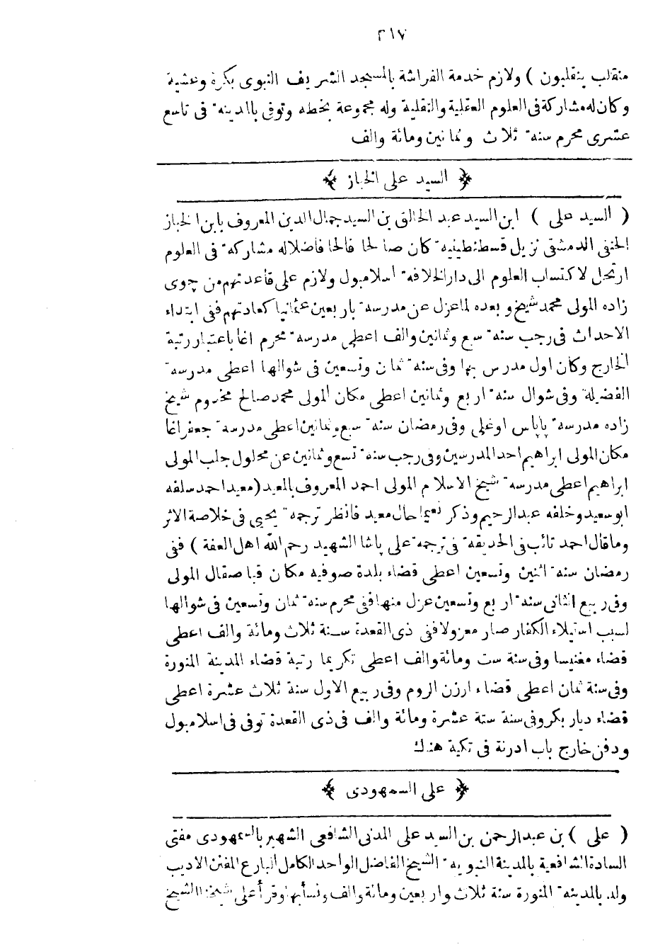 علي بن عبد الرحمن بن السيد علي المدني الشافعي الشهير بالسمهودي مفتي السادة الشافعية بالمدينة النبوية الشيخ الفاضل الواحد الكامل البارع المفنن الأديب ولد بالمدينة المنورة سنة ثلاث وأربعين ومائة وألف ونشأ بها وقرأ على شيخنا الشيخ