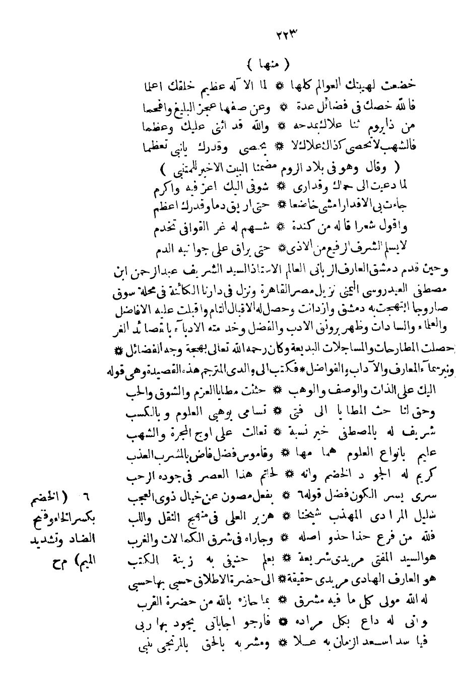 وحين قدم دمشق العارف الرباني العالم الأستاذ السيد الشريف عبد الرحمن ابن مصطفى العيدروسي اليمني نزيل مصر القاهرة ونزل في دارنا الكائنة في محلة سوق صاروجا ابتهجت به دمشق وازدانت وحصل له الاقبال التام وأقبلت عليه الأفاضل والعلماء والسادات وظهر برونق الأدب والفضل وخدمته الأدباء بالقصائد الغر حصلت المطارحات والمساجلات البديعة وكان رحمه الله تعالى بهجة وجه الفضائل ونير سماء المعارف والآداب والفواضل فكتب إلى والدي المترجم هذه القصيدة وهي قوله