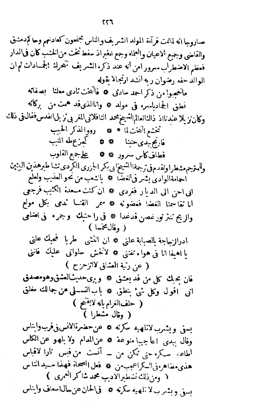 صاروجا إنه لما تمت قراءة المولد الشريف والناس مجتمعون كعادتهم وحاكم دمشق والقاضي وجميع الأعيان والعلماء وجمع غفير إذ حفظ تخت من الخشب كان في الدار فعظم الاضطراب سرور أمن إنه عند ذكره الشريف تتحرك الجمادات ثم إن الوالد حفه رضوان ربه أنشد ارتجالاً بقوله