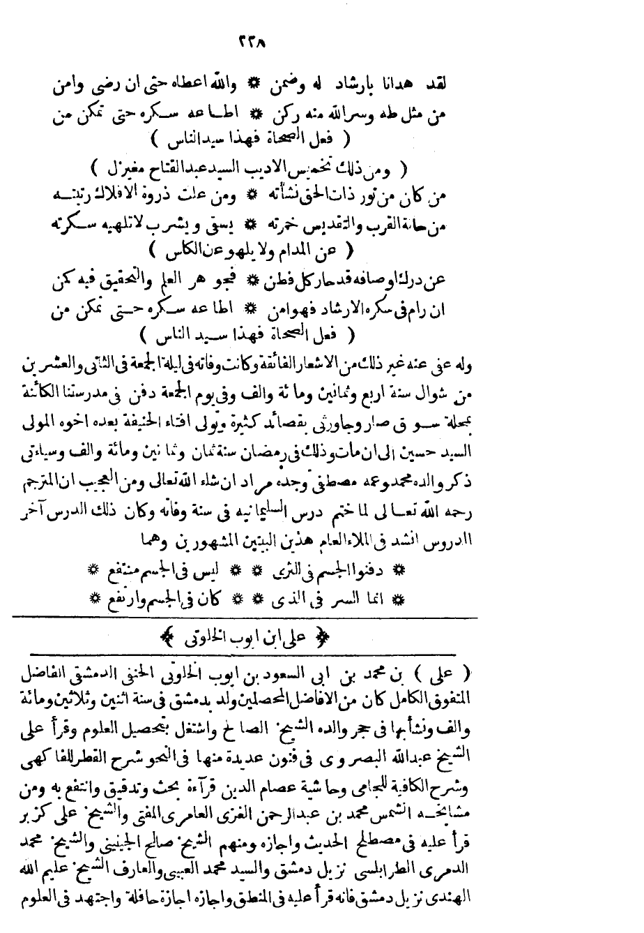 وله عفى عنه غير ذلك من الأشعار الفائقة وكانت وفاته في ليلة الجمعة في الثاني والعشرين من شوال سنة أربع وثمانين ومائة وألف وفي يوم الجمعة دفن في مدرستنا الكائنة بمحلة سوق صاروجا ورثى بقصائد كثيرة وتولى افتاء الحنيفة بعده أخوه المولى السيد حسين إلى أن مات وذلك في رمضان سنة ثمان وثمانين ومائة وألف وسيأتي ذكره والده محمد وعمه مصطفى وجده مراد إن شاء الله تعالى ومن العجيب إن المترجم رحمه الله تعالى لما ختم درس السليمانية في سنة وفاته وكان ذلك الدرس آخر الدروس أنشد في الملاء العام هذين البيتين المشهورين وهما