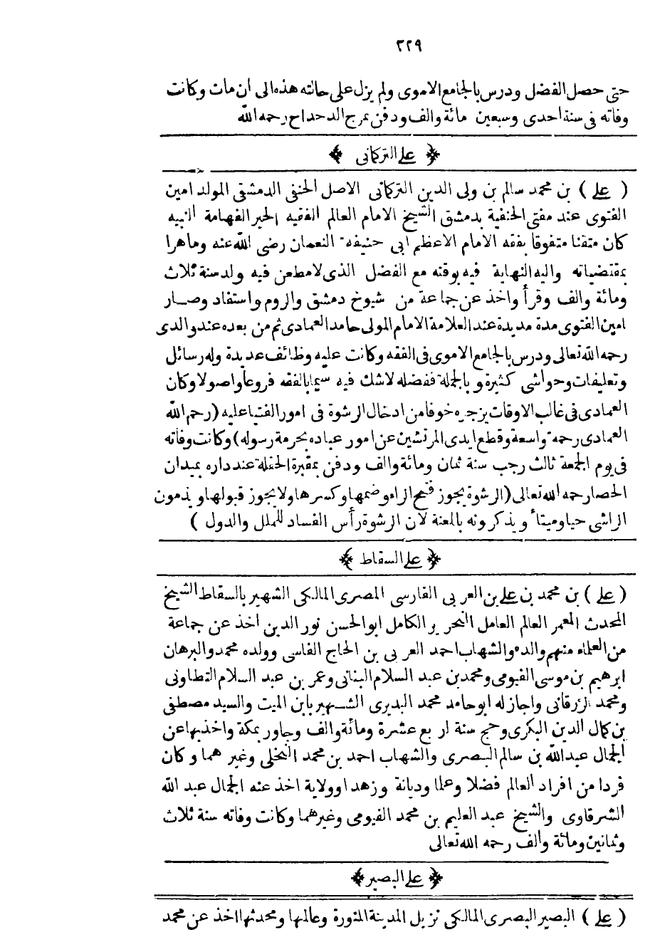 علي بن محمد سالم بن ولي الدين التركماني الأصل الحنفي الدمشقي المولد أمين الفتوي عند مفتي الحنفية بدمشق الشيخ الامام العالم الفقيه الحبر الفهامة النبيه كان متقناً متفوقاً بفقه الامام الأعظم أبي حنيفة النعمان رضي الله عنه وماهراً بمقتضياته وإليه النهاية فيه بوقته مع الفضل الذي لا مطعن فيه ولد سنة ثلاث ومائة وألف وقرأ وأخذ عن جماعة من شيوخ دمشق والروم واستفاد وصار أمين الفتوى مدة مديدة عند العلامة الامام المولى حامد العمادي ثم من بعده عند والدي رحمه الله تعالى ودرس بالجامع الأموي في الفقه وكانت عليه وظائف عديدة وله رسائل وتعليقات وحواشي كثيرة وبالجملة ففضله لا شك فيه سيما بالفقه فروعاً وأصولاً وكان العمادي في غالب الأوقات يزجره خوفاً من ادخال الرشوة في أمور الفتيا عليه رحم الله العمادي رحمة واسعة وقطع أيدي المرتشين عن أمور عباده بحرمة رسوله وكانت وفاته في يوم الجمعة ثالث رجب سنة ثمان ومائة وألف ودفن بمقبرة الحفلة عند داره بميدان الحصا رحمه الله تعالى الرشوة يجوز فتح الراء وضمها وكسرها ولا يجوز قبولها ويذمون الراشي حياً وميتاً ويذكرونه باللعنة لأن الرشوة رأس الفساد للملل والدول.