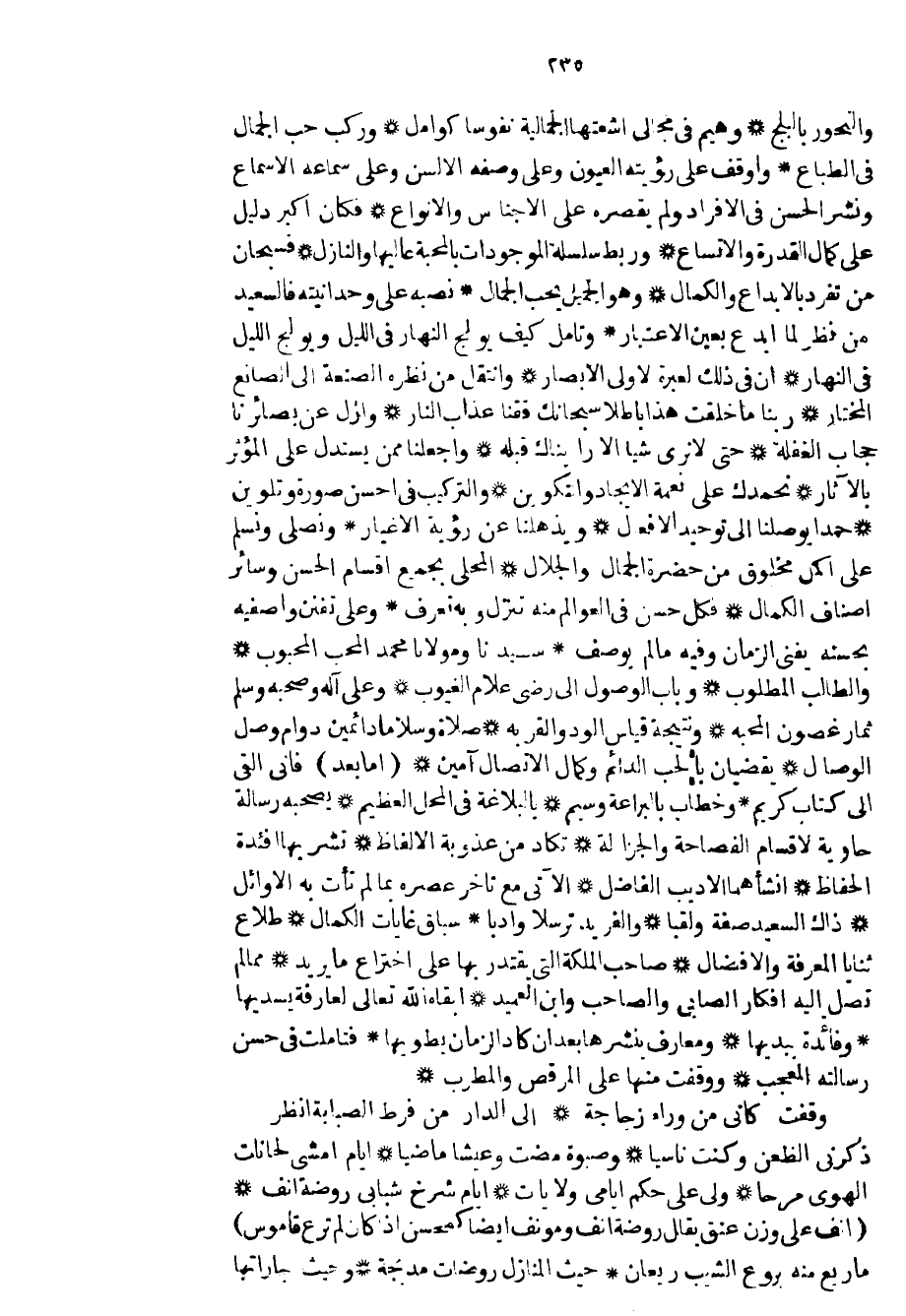 والنحور بالبلج وهيم في مجالي أشعتها الجمالية نفوساً كوامل وركب حب الجمال في الطباع وأوقف على رؤيته العيون وعلى وصفه الألسن وعلى سماعه الأسماع ونشر الحسن في الأفراد ولم يقصره على الأجناس والأنواع فكان أكبر دليل على كمال القدرة والاتساع وربط سلسلة الموجودات بالمحبة عاليها والنازل فسبحان من تفرد بالابداع والكمال وهو الجميل يحب الجمال نصبه على وحدانيته فالسعيد من نظر لما أبدع بعين الأعتبار وتأمل كيف يولج النهار في الليل ويولج الليل في النهار إن في ذلك لعبرة لأولي الأبصار وانتقل من نظرة الصنعة إلى الصانع المختار ربنا ما خلقت هذا باطلاً سبحانك قفنا عذاب النار وأزل عن بصائرنا حجاب الغفلة حتى لا نرى شيئاً إلا رأيناك قبله واجعلنا ممن يستدل على المؤثر بالآثار نحمدك على نعمة الايجاد والتكوين والتركيب في أحسن صورة وتلوين حمداً يوصلنا إلى توحيد الأفعال ويذهلنا عن رؤية الأغيار ونصلي ونسلم على أكمل مخلوق من حضرة الجمال والجلال المحلي بجميع أقسام الحسن وسائر أصناف الكمال فكل حسن في العوالم منه تنزل وبه تعرف وعلى تفنن واصفيه بحسنه يفنى الزمان وفيه ما لم يوصف سيدنا ومولانا محمد المحب المحبوب والطالب المطلوب وباب الوصول إلى رضى علام الغيوب وعلى آله وصحبه وسلم ثمار غصون المحبة ونتيجة قياس الود والقربة صلاة وسلاماً دائمين دوام وصل الوصال يقضيان بالحب الدائم وكمال الاتصال آمين أما بعد فإني ألقى إلى كتاب كريم وخطاب بالبراعة وسيم بالبلاغة في المحل العظيم يصحبه رسالة حاوية لأقسام الفصاحة والجزالة تكاد من عذوبة الألفاظ تشربها أفئدة الحفاظ أنشأهما الأديب الفاضل الآتي مع تأخر عصره بما لم تأت به الأوائل ذاك السعيد صفة ولقباً والفريد ترسلاً وأدباً سباق غايات الكمال طلاع ثنايا المعرفة والأفضال صاحب الملكة التي يقتدر بها على اختراع ما يريد مما لم تصل إليه أفكار الصابي والصاحب وابن العميد أبقاه الله تعالى لعارفة يسديها وفائدة يبديها ومعارف ينشرها بعد أن كاد الزمان يطويها فتأملت في حسن رسالته المعجب ووقفت منها على المرقص والمطرب