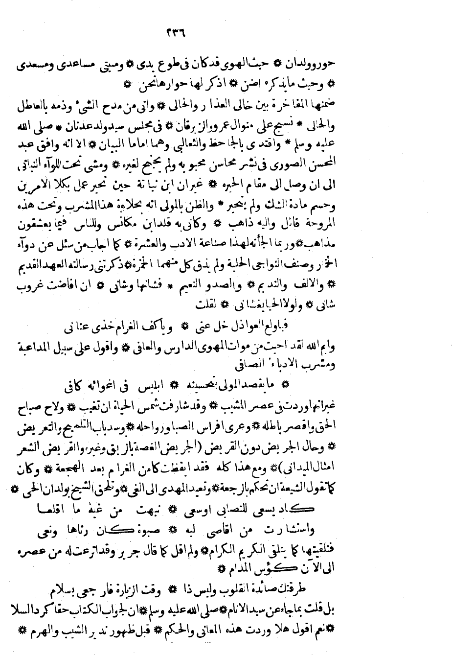حور وولدان حيث الهوى قد كان في طوع يدي ومنيتي مساعدي ومسعدي وحيث ما يذكره أضن أذكر لها حوارها نحن ضمنها المفاخرة بين خالي العذار والحالي وأتى من مدح الشيء وذمه بالعاطل والحالي نسج على منوال عمرو والزبرقان في مجلس سيد ولد عدنان صلى الله عليه وسلم واقتدى بالجاحظ والثعالبي وهما اماما البيان إلا أنه وافق عبد المحسن الصوري في نشر محاسن محبوبه ولم يجنح لغيره ومشى تحت اللواء النباتي إلى أن وصل إلى مقام الحيرة غير أن ابن نباتة حين تحير عمل بكلا الأمرين وحسم مادة الشك ولم يتحير والظن بالمولى إنه بحلاوة هذا المشرب وتحت هذه المروحة قائل وإليه ذاهب وكأني به قلد ابن مكانس وللناس فيما يعشقون مذاهب وربما ألجأته لهذا صناعة الأدب والعشرة كما أجاب من سئل عن دواء الخمار وصنف النواجي الحلبة ولم يذق كل منهما الخمرة ذكرتني رسالته العهد القديم والألف والنديم والصد والنعيم فشأنها وشأني إن أفاضت غروب شأني ولولا الحيا يغشاني لقلت