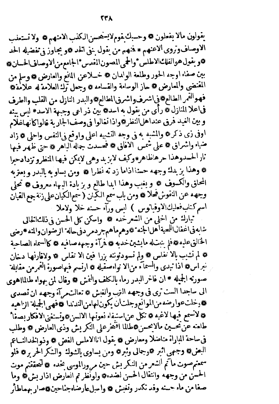 شابه في إغفال اللحية أهل الجنة وهم ما هم جرد مرد في حالة الرضوان والمنة رضي الخالق عليه فلم ينبت له ما يشين خديه فمرآة وجهه صافية كالسماء الصاحية لم تشيب بالأنفاس ولم تسود نونته بزرافين الأنقاس ولا قارنها دخان نبراس إذا تبدى والسماء من الأنواء صقيلة ارتسم فيها صورة القمر من مقابلة صورته الجميلة إن فاخر البدر رماه بالكلف والنمش وقال لمن يهواه طالما أهوى إلى ساجداً الست ترى في وجهه الترب والغبش تعالت مرآة وجهه إن تصدى وخلت عوارضه من الموانع وجلت أن يكون لها من الند ندا فهي الجميلة الزاهية لا تسمع فيها لاغيه تكل عن استيفاء نعوتها الألسن وتستغني الأفكار بصفاء طلعته عن تحسين ما لا يحسن طالما افتخر على النكريش وذي العارض وطلب في ساحة المباراة مناضلاً ومعارض يقول أنا الأملس الغض وذو الخد الناعم البض وجهي أثير وجمالي وثير ومن يساوي بالشوك والشكر الحرير فلو سمعتم صوت مآتم الشعر من النكريش حين مرور الموسى بخده لتحققتم موت الحسن من وجهه وانتقال الحسن لضده ولو نظرتم العارض إذا ريش وما صفا من ماء حسنه وقد تكدر وتغبش وأسبل عارضاه جناحين صار بهما طائر