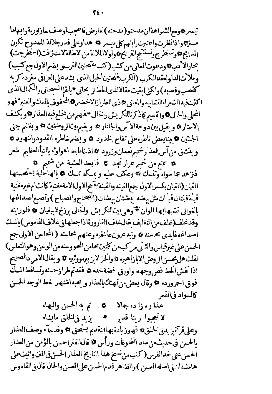 تيسر ومع الشراهة إن مدحت ومدحته لعارض فاعجب لوصف حازتورية وايهاما مستر وإذا نظرت واعتبرت رأيتهم كل ميسر هذا وعلى قدر جلالة الممدوح تكون المدايح وتستخرج وتستنتج القرايح ولولا الملالة من الاطالة لأستنزفت استخرجت بحار الأدب ودعوت المعاني من كثب كثب بفتحتين القرب وبضم الأول جع كثيب وملأت الدلو لعقد الكرب الكرب بفتحتين الحبل الذي يشد على العراقي مفرده كربه كقصب وقصبه ولكني أبقيت مقالاً لذي الخط الريحاني بالقلم السبحاني والكمال الذي أكثرت فيه الشعراء التشابيه والمعاني ذي الطراز الأخضر المحفوف بالمسك والعنبر فهو المحلي والحالي والقسيم كما ذكرنا للنكريش والخالي فمنهم من يخلع فيه العذار ويكشف الأستار ويقبل بين دوحة الآس والجلنار ويقيم بين الروضيتين ويغتنم جني الجنتين بينا يعض ناظره على تفاح الخدود ويضم خاطره القدود والنهود وينتشق من آس العذار شميم نعمان وزرود إذ خاطبه أهواؤه بالنبأ العظيم شعر