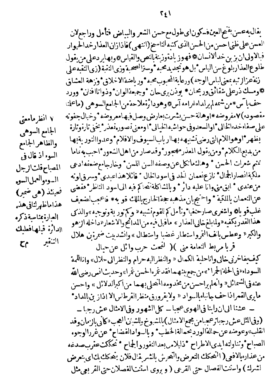 يقال به عسن بفتح العين فسكون أي طول مع حسن الشعر والبياض فتأمل وراجع لأن العسن على ظني أحسن من الحسن الذي كتبه الناسخ انتهى فإذا زان العذار خد الحيوار فبالأولى أن يزين خد الإنسان فهو زيادة وزينة بالنص والقياس وبها يرد على من يقول طلوع العذار بلوغ سن اليأس بل هو تجديد محبة وستر الصحبة وزي النقبة زي النقبة على زنة عز الرتبة بمعنى لباس الوجه ورعاية المحبوب محبة ورياضة الأخلاق ونزهة العشاق ومسك ذر على شقائق وريحان يوذن بري حان وجميعة ألوان وذواتا أفنان وورد حف بآس من شمه لم ير لداء غرامه آس وهو دائرة ملاحة من الجامع السوهي ما علمنا مقصوده مفروضه أو هالة حسن بشرت بعارض وصل فيها معروضه وخيال جفونه على صفاء خده الخالي أو السعد وفي حواشيه الخيالي أو معنى تصوره تعذر يخفي تارة وتارة يظهر أو هو اللام التي رضى تشبيهه بها أرباب السيوف والأقلام وعدوا التورية بها من بديع الكلام ومن يقول المعذر مهجور وقد صار من أهل الشعور أحبب به نماماً نمنم شعرات الحسن وهاك ما تكل عن وصفه ألسن اللسن وخارجاً مع ضعفه أدعى ملكية أنصار الجمال نازع نعمان الخد في أسود الخال قائلاً هذا عبدي وسرق لونه من عندي ابق مني وأنا عليه دائر وبالمشاكلة نتحاكم فيه إلى أسود الناظر فقضى عن النعمان بالملكية واحتج بأن مذهبه حجة الخارج بالملك قويه فأعجب لضعيف غلب قوياً وأشغرى صار حنفياً وتأمل كم للقوم تشبيه وكم تورية وتوجيه والذكي هذا القدر يكفيه ولما بلغ خالي العذار ما قيل فيه من المدائح والأشعار داخله الزهو والكبر وعطس بأنف النمر واستطار غضباً واستطال وأنشد بيت ضمرة بن هلال