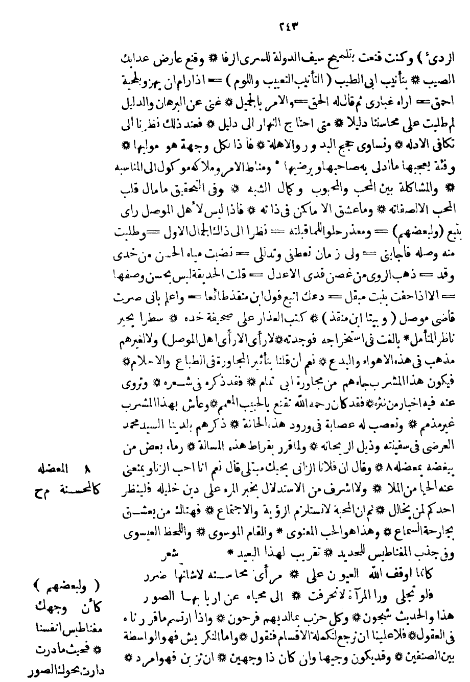 المتأمل بالغت في استخراجه فوجدته لا رأى إلا رأى أهل الموصل ولا لغيرهم مذهب في هذه الأهواء والبدع نعم إن قلنا بتأثير المجاورة في الطباع والأحلام فيكون هذا المشرب جاءهم من مجاورة أبي تمام فقد ذكره في شعره وتروى عنه في أخبار من نثره فقد كان رحمه الله تقنع بالحبيب المعمم وعاش بهذا المشرب غير مذمم وتعصب له عصابة في ورود هذه الحانة ذكرهم بلدينا السيد محمد العرضي في سفينته وذيل الريحانة ولما قرر بقراط هذه المسألة رماه بعض من يبغضه بمعضله وقال إن فلاناً الزاني بحبك مبتلي قال نعم أنا أحب الزنا ويمنعني عنه الحيا من الملا ولا أشرف من الأستدلال بخبر المرء على دين خليله فلينظر أحدكم لمن يخالل ثم إن المحبة لا تستلزم الرؤية والاجتماع فهناك من يعشق بجارحة السماع وهذا هو الحب المعنوي والمقام الموسوي واللحظ العيسوي وفي جذب المغناطيس للحديد تقريب لهذا البعيد شعرالمتأمل بالغت في استخراجه فوجدته لا رأى إلا رأى أهل الموصل ولا لغيرهم مذهب في هذه الأهواء والبدع نعم إن قلنا بتأثير المجاورة في الطباع والأحلام فيكون هذا المشرب جاءهم من مجاورة أبي تمام فقد ذكره في شعره وتروى عنه في أخبار من نثره فقد كان رحمه الله تقنع بالحبيب المعمم وعاش بهذا المشرب غير مذمم وتعصب له عصابة في ورود هذه الحانة ذكرهم بلدينا السيد محمد العرضي في سفينته وذيل الريحانة ولما قرر بقراط هذه المسألة رماه بعض من يبغضه بمعضله وقال إن فلاناً الزاني بحبك مبتلي قال نعم أنا أحب الزنا ويمنعني عنه الحيا من الملا ولا أشرف من الأستدلال بخبر المرء على دين خليله فلينظر أحدكم لمن يخالل ثم إن المحبة لا تستلزم الرؤية والاجتماع فهناك من يعشق بجارحة السماع وهذا هو الحب المعنوي والمقام الموسوي واللحظ العيسوي وفي جذب المغناطيس للحديد تقريب لهذا البعيد شعر