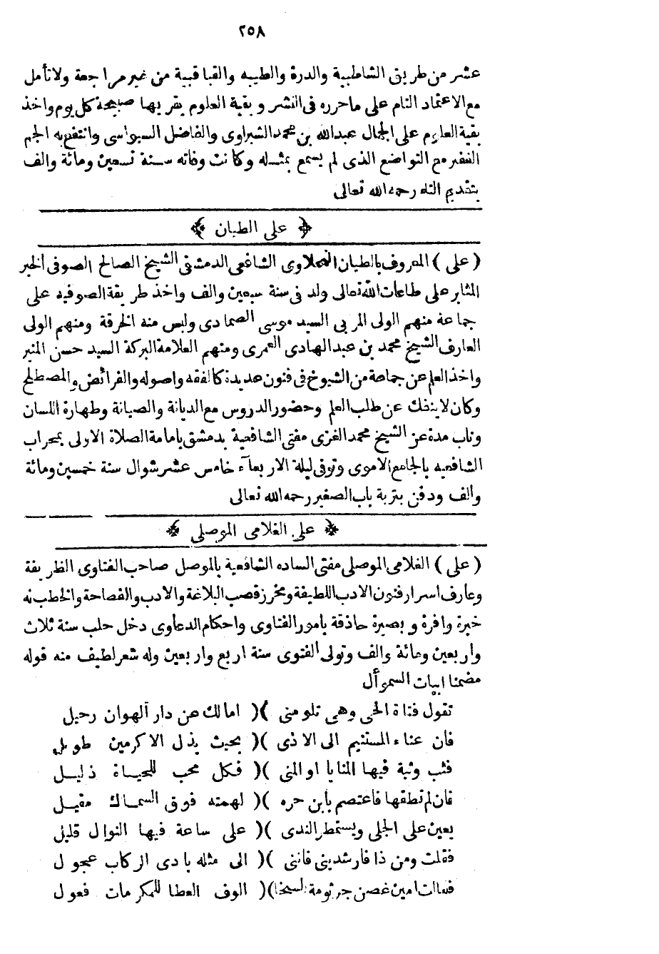 علي الغلامي الموصلي مفتي السادة الشافعية بالموصل صاحب الفتاوي الظريفة وعارف أسرار فنون الأدب اللطيفة ومخرز قصب البلاغة والأدب والفصاحة والخطب له خبرة وافرة وبصيرة حاذقة بأمور الفتاوي وأحكام الدعاوي دخل حلب سنة ثلاث وأربعين ومائة وألف وتولى الفتوى سنة أربع وأربعين وله شعر لطيف منه قوله مضمناً أبيات السموأل