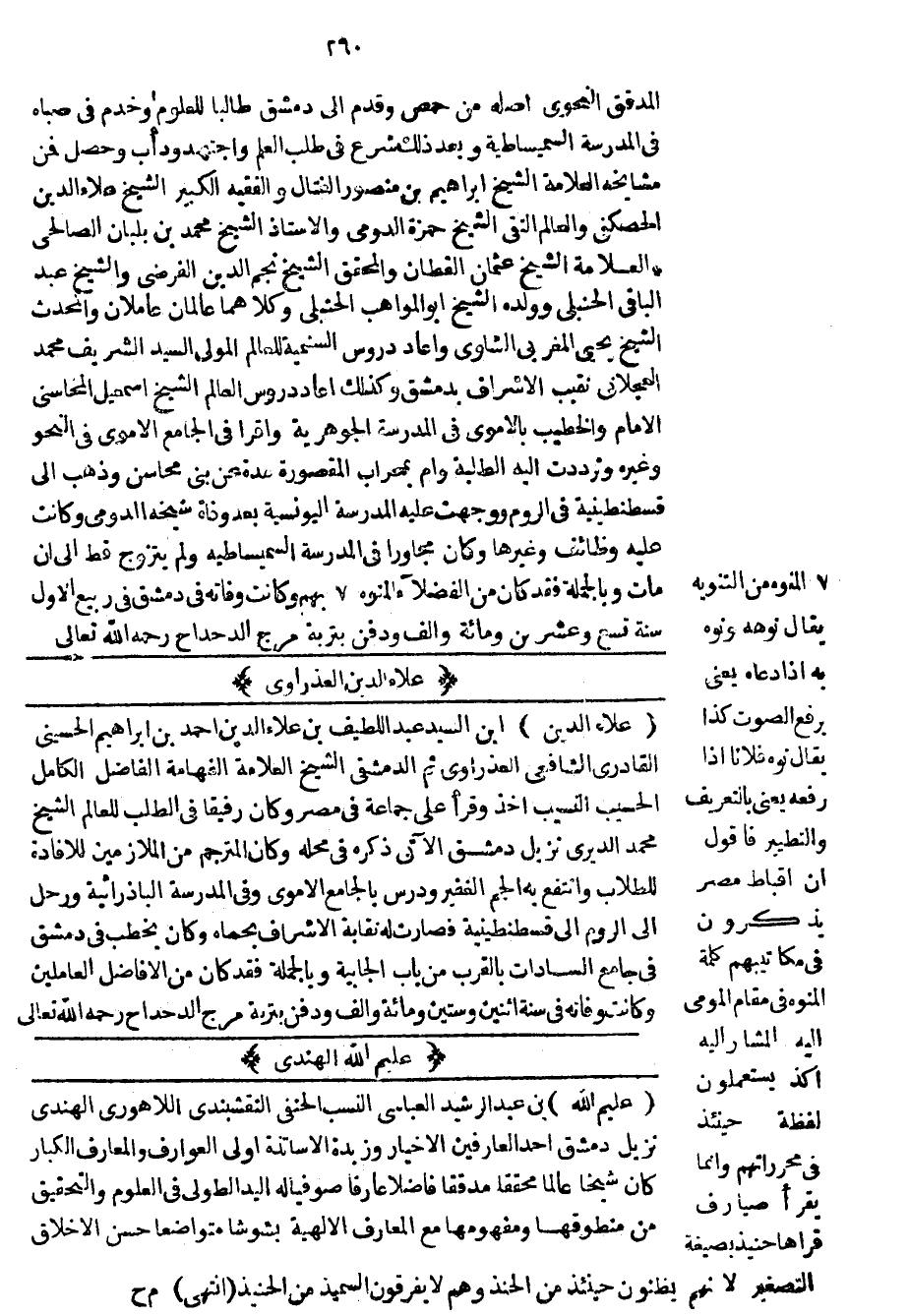 المدقق النحوي أصله من حمص وقدم إلى دمشق طالباً للعلوم وخدم في صباه في المدرسة السميساطية وبعد ذلك شرع في طلب العلم واجتهد ودأب وحصل فمن مشايخه العلامة الشيخ إبراهيم بن منصور الفتال والفقيه الكبير الشيخ علاء الدين الحصكفي والعالم التقي الشيخ حمزة الدومي والأستاذ الشيخ محمد بن بلبان الصالحي والعلامة الشيخ عثمان القطان والمحقق الشيخ نجم الدين الفرضي والشيخ عبد الباقي الحنبلي وولده الشيخ أبو المواهب الحنبلي وكلاهما عالمان عاملان والمحدث الشيخ يحيى المغربي الشاوي وأعاد دروس السنمية للعالم المولى السيد الشريف محمد العجلاني نقيب الأشراف بدمشق وكذلك أعاد دروس العالم الشيخ إسمعيل المحاسني الامام والخطيب بالأموي في المدرسة الجوهرية وأقرأ في الجامع الأموي في النحو وغيره وترددت إليه الطلبة وأم بمحراب المقصورة مدة عن بني محاسن وذهب إلى قسطنطينية في الروم ووجهت عليه المدرسة اليونسية بعد وفاة شيخه الدومي وكانت عليه وظائف وغيرها وكان مجاوراً في المدرسة السميساطية ولم يتزوج قط إلى أن مات وبالجملة فقد كان من الفضلاء المنوه بهم وكانت وفاته في دمشق في ربيع الأول سنة تسع وعشرين ومائة وألف ودفن بتربة مرج الدحداح رحمه الله تعالى.