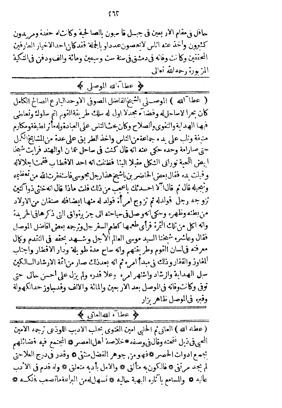 عطاء الله الموصلي الشيخ الفاضل الصوفي الأوحد البارع الصالح الكامل كان بحراً لا ساحل له وفضاء مجدلاً أول له سلك طريقة القوم أتم سلوك وتعاطى فيها الهداية والتقوى والصلاح وكان يحث الناس على العبادة وله مأثر لطيفة ومكارم منيفة وناب على يده جماعة من الناس وأخذ الطريق على عدة من المشايخ الكمل حتى صار أمة وحده حكى عنه إنه قال كنت في ساحل عمان أو الهند فرأيت شيخاً أبيض اللحية نوراني الشكل مقبلاً إلينا فظننت إنه أحد الأقطاب فقمت إجلالاً له وقبلت يده فقال بعض الحاضرين يا شيخ هذا رجل مجوسي فاستغفرت الله من تعظيمه وتبجيله قال ثم قال آلا أحدثك بأعجب من ذلك قلت ماذا قال إنه خنثى ذو آلتين تزوجه رجل فولد له ثم تزوج امرأة فولد له منها أيضاً فله صنفان من الأولاد من بطنه وظهره وحكى أنه وصل في سياحته إلى جزيرة واق التي ذكرها في الخريدة وإنه أكل من تلك الثمرة فرأى طعمها كطعم السفرجل وترجمه بعض أفاضل الموصل فقال وعاشره شيخنا السيد موسى العالم الأجل وشهد بحفه في التقدم وكمال معرفته في لسان القوم وطريقتهم وإنه ساح مدة طويلة ودار الأقطار واجتاب المفاوز والقفار وذلك في مبدأ أمره ثم إنه بعد ذلك صار من أئمة الأرشاد السالكين سبل الهداية والرشاد واشتهر أمره وعلا قدره ولم يزل على أحسن حالي حتى توفي وكانت وفاته في الموصل بعد الأربعين والمائة والألف وقد جاوز حد الكهولة وقبره في الموصل ظاهر يزار.