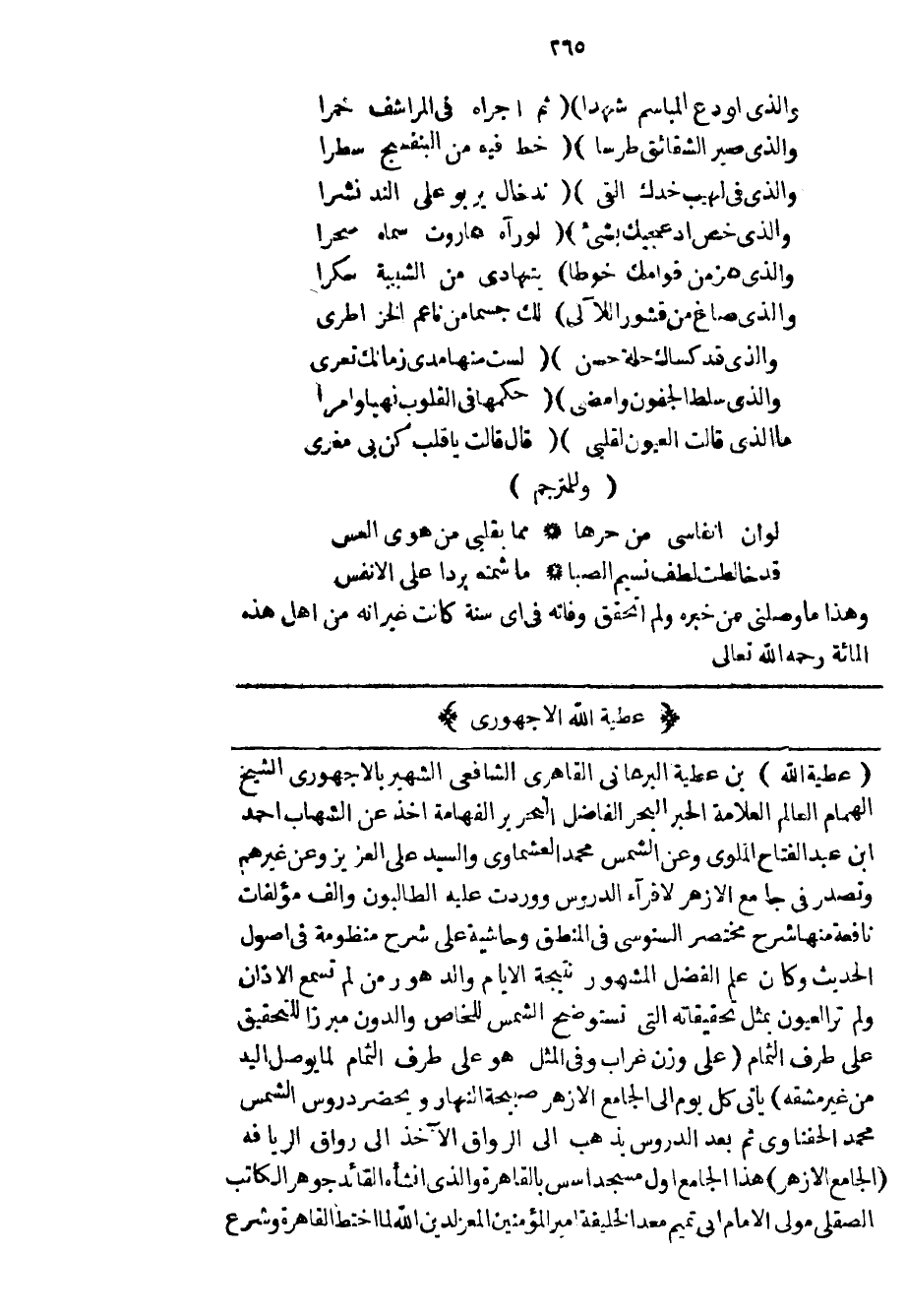 عطية الله بن عطية البرهاني القاهري الشافعي الشهير بالأجهوري الشيخ الهمام العالم العلامة الحبر البحر الفاضل النحرير الفهامة أخذ عن الشهاب أحمد ابن عبد الفتاح الملوي وعن الشمس محمد العشماوي والسيد علي العزيز وعن غيرهم وتصدر في جامع الأزهر لأقراء الدروس ووردت عليه الطالبون وألف مؤلفات نافعة منها شرح مختصر السنوسي في المنطق وحاشية على شرح منظومة في أصول الحديث وكان علم الفضل المشهور نتيجة الأيام والدهور من لم تسمع الآذان ولم تر العيون بمثل تحقيقاته التي تستوضح الشمس للخاص والدون مبرزاً للتحقيق على طرف الثمام على وزن غراب وفي المثل هو على طرف الثمام لما يوصل اليد من غير مشقه يأتي كل يوم إلى الجامع الأزهر صبيحة النهار ويحضر دروس الشمس محمد الحفناوي ثم بعد الدروس يذهب إلى الرواق الآخذ إلى رواق الريافه الجامع الأزهر هذا الجامع أول مسجد أسس بالقاهرة والذي أنشأه القائد جوهر الكاتب الصقلي مولى الامام أبي تميم معد الخليفة أمير المؤمنين المعز لدين الله لما اختط القاهرة وشرع