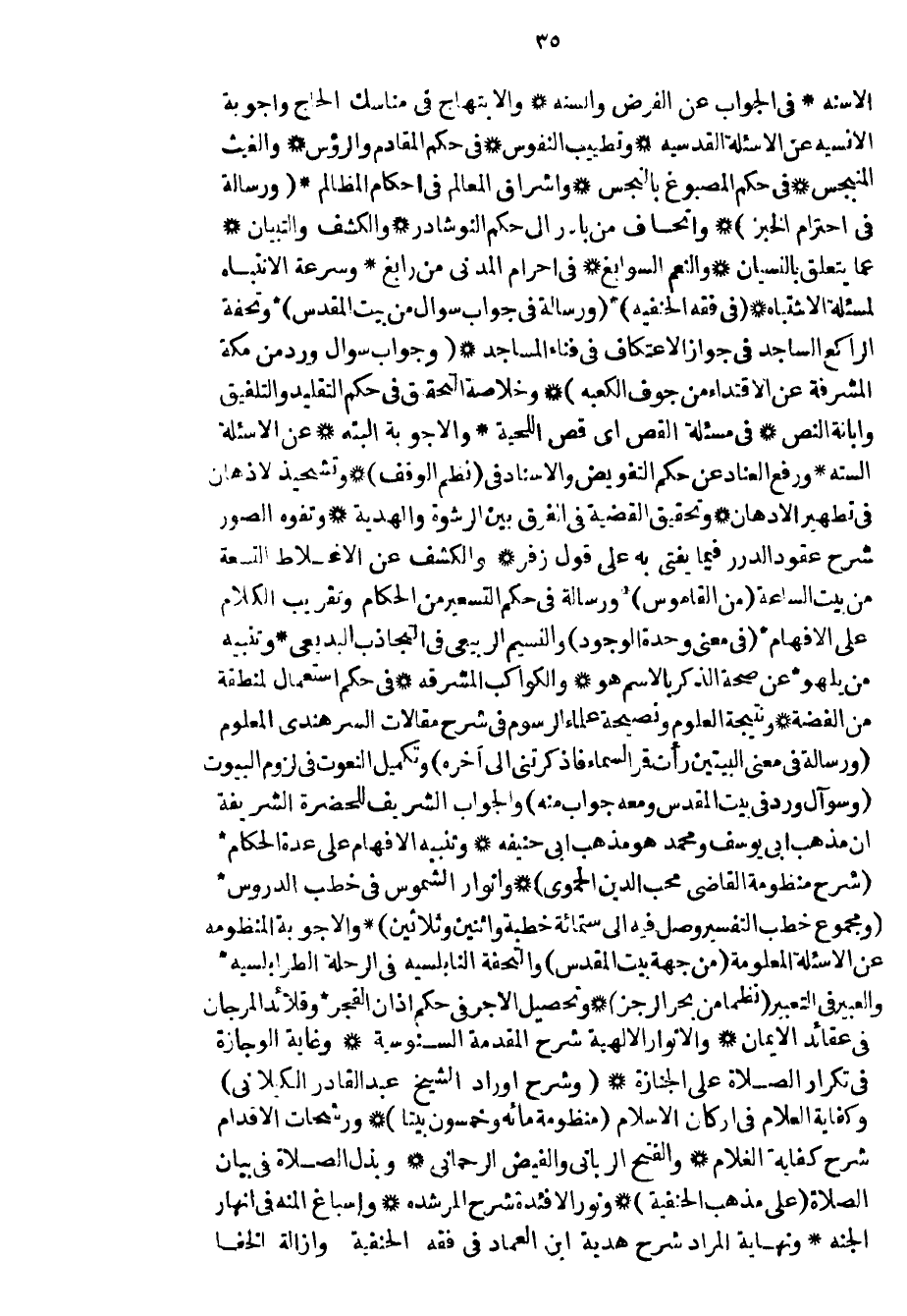 الأسنه في الجواب عن الفرض والسنه والابتهاج في مناسك الحاج وأجوبة الأنسيه عن الأسئلة القدسيه وتطييب النفوس في حكم المقادم والرؤس والغيث المنبجس في حكم المصبوغ بالنجس واشراق المعالم في أحكام المظالم ورسالة في احترام الخبز واتحاف من بادر إلى حكم النوشادر والكشف والتبيان عما يتعلق بالنسيان والنعم السوابغ في احرام المدني من رابغ وسرعة الانتباه لمسئلة الاشتباه في فقه الحنفية ورسالة في جواب سؤال من بيت المقدس وتحفة الراكع الساجد في جواز الاعتكاف في فناء المساجد وجواب سؤال ورد من مكة المشرفة عن الاقتداء من جوف الكعبة وخلاصة التحقيق في حكم التقليد والتلفيق وابانة النص في مسئلة القص أي قص اللحية والأجوبة البته عن الأسئلة السته ورفع العناد عن حكم التفويض والاسناد في نظم الوقف وتشحيذ لأذهان في تطهير الأدهان وتحقيق القضية في الفرق بين الرشوة والهدية وتفوه الصور شرح عقود الدرر فيما يفتي به على قول زفر والكشف عن الأغلاط التسعة من بيت الساعة من القاموس ورسالة في حكم التسعير من الحكام وتقريب الكلام على الافهام في معنى وحدة الوجود والنسيم الربيعي في التجاذب البديعي وتنبيه من يلهو عن صحة الذكر بالاسم هو والكواكب المشرقة في حكم استعمال لمنطقة من الفضة ونتيجة العلوم ونصيحة علماء الرسوم في شرح مقالات السرهندي المعلوم ورسالة في معنى البيتين رأت قمر السماء فاذكرتني إلى آخره وتكميل النعوت في لزوم البيوت وسؤال ورد في بيت المقدس ومعه جواب منه والجواب الشريف للحضرة الشريفة إن مذهب أبي يوسف ومحمد هو مذهب أبي حنيفة وتنبيه الافهام على عدة الحكام شرح منظومة القاضي محب الدين الحموي وأنوار الشموس في خطب الدروس ومجموع خطب التفسير وصل فيه إلى ستمائة خطبة واثنين وثلاثين والأجوبة المنظومة عن الأسئلة المعلومة من جهة بيت المقدس والتحفة النابلسية في الرحلة الطرابلسية والعبير في التعبير نظماً من بحر الرجز وتحصيل الأجر في حكم أذان الفجر وقلائد المرجان في عقائد الايمان والأنوار الألهية شرح المقدمة السنوسية وغاية الوجازة في تكرار الصلاة على الجنازة وشرح أوراد الشيخ عبد القادر الكيلاني وكفاية العلام في أركان الاسلام منظومة مائة وخمسون بيتاً ورشحات الاقدام شرح كفاية الغلام والفتح الرباني والفيض الرحماني وبذل الصلاة في بيان الصلاة على مذهب الحنفية ونور الأفئدة شرح المرشدة واسباغ المنه في أنهار الجنة ونهاية المراد شرح هدية ابن العماد في فقه الحنفية وإزالة الخفا