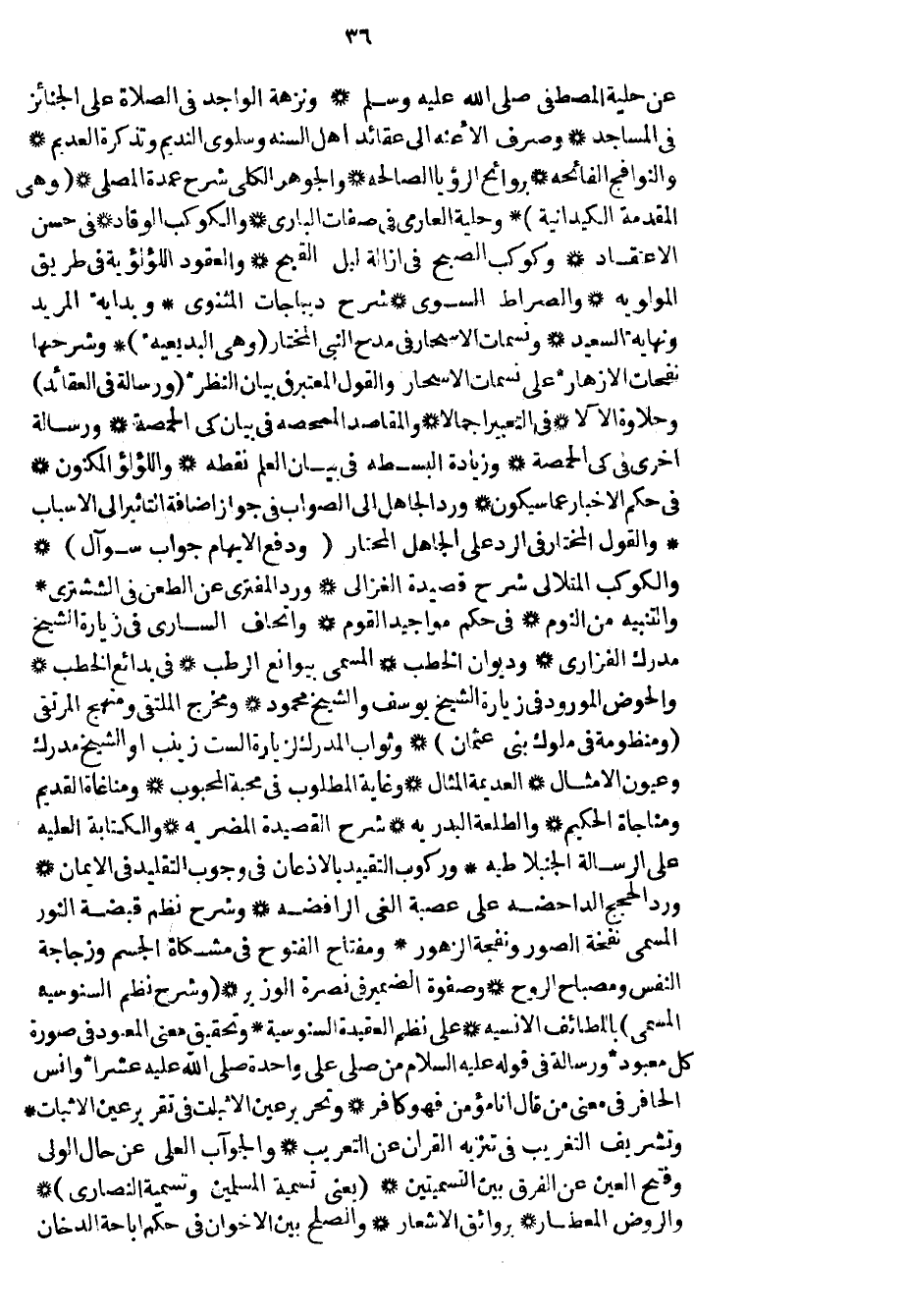 عن حلية المصطفى صلى الله عليه وسلم ونزهة الواجد في الصلاة على الجنائز في المساجد وصرف الأعنه إلى عقائد أهل السنه وسلوى النديم وتذكرة العديم والنوافج الفائحة بروائح الرؤيا الصالحة والجوهر الكلي شرح عمدة المصلي وهي المقدمة الكيدانية وحلية العارمي في صفات الباري والكوكب الوقاد في حسن الاعتقاد وكوكب الصبح في إزالة ليلة