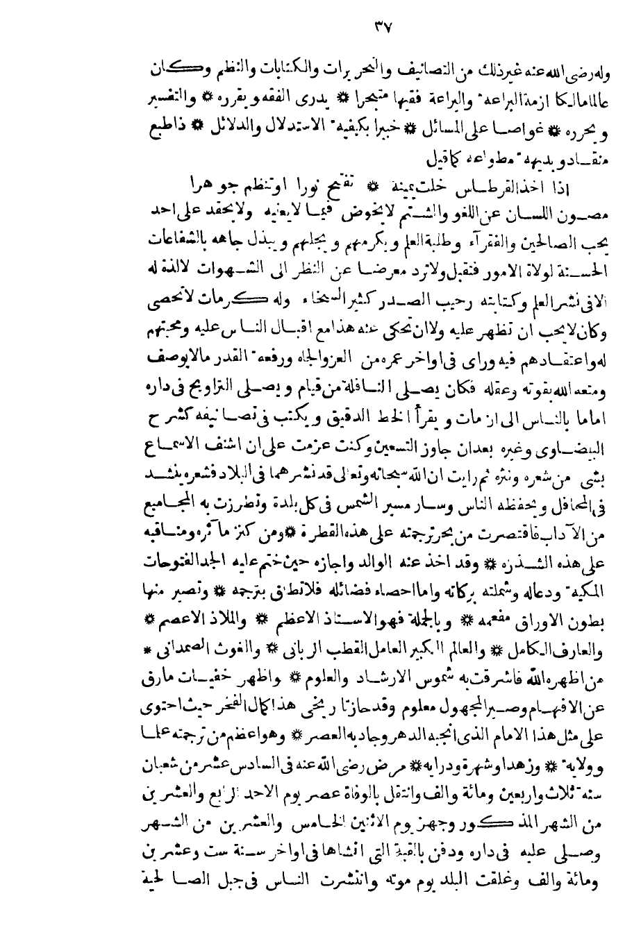وله رضي الله عنه غير ذلك من التصانيف والتحريرات والكتابات والنظم وكان عالماً مالكاً أزمة البراعة واليراعة فقيهاً متبحراً يدري الفقه ويقرره والتفسير ويحرره غواصاً على المسائل خبيراً بكيفية الاستدلال والدلائل ذا طبع منقاد وبديهة مطواعه كما قيل