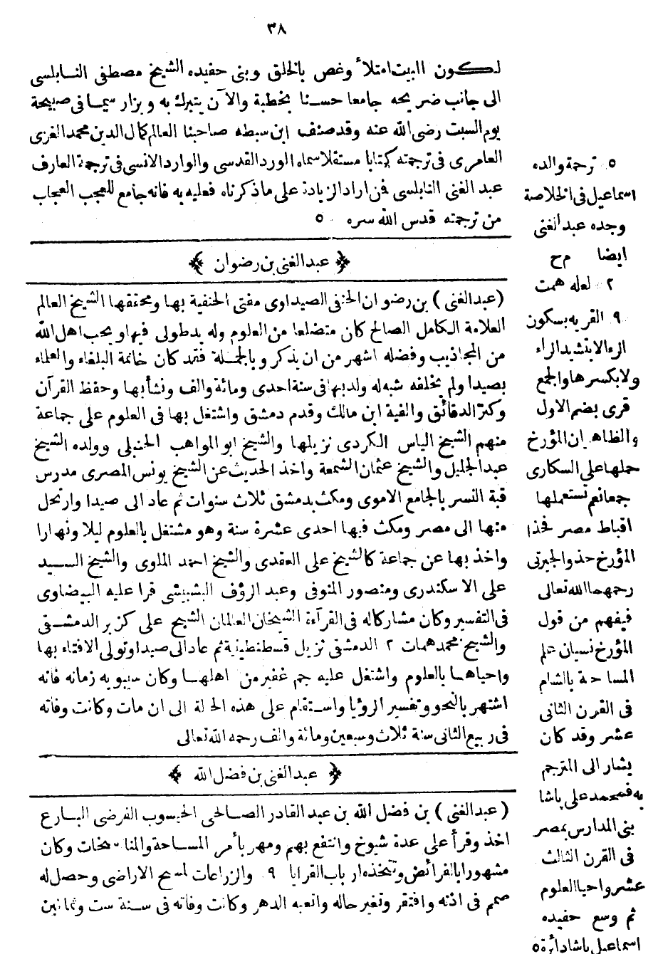 عبد الغني بن رضوان الحنفي الصيداوي مفتي الحنفية بها ومحققها الشيخ العالم العلامة الكامل الصالح كان متضلعاً من العلوم وله يد طولى فيها ويحب أهل الله من المجاذيب وفضله أشهر من أن يذكر وبالجملة فقد كان خاتمة البلغاء والعلماء بصيدا ولم يخلفه شبه له ولد بها في سنة احدى ومائة وألف ونشأ بها وحفظ القرآن وكنز الدقائق وألفية ابن مالك وقدم دمشق واشتغل بها في العلوم على جماعة منهم الشيخ الياس الكردي نزيلها والشيخ أبو المواهب الحنبلي وولده الشيخ عبد الجليل والشيخ عثمان الشمعة وأخذ الحديث عن الشيخ يونس المصري مدرس قبة النسر بالجامع الأموي ومكث بدمشق ثلاث سنوات ثم عاد إلى صيدا وارتحل منها إلى مصر ومكث فيها احدى عشرة سنة وهو مشتغل بالعلوم ليلاً ونهاراً وأخذ بها عن جماعة كالشيخ علي العقدي والشيخ أحمد الملوي والشيخ السيد علي الاسكندري ومنصور المنوفي وعبد الرؤف البشبيشي قرأ عليه البيضاوي في التفسير وكان مشاركاً له في القراءة الشيخان العالمان الشيخ علي كزبر الدمشقي والشيخ محمد همات الدمشقي نزيل قسطنطينية ثم عاد إلى صيدا وتولى الافتاء بها وأحياها بالعلوم واشتغل عليه جم غفير من أهلها وكان سيبويه زمانه فإنه اشتهر بالنحو وتفسير الرؤيا واستقام على هذه الحالة إلى أن مات وكانت وفاته في ربيع الثاني سنة ثلاث وسبعين ومائة وألف رحمه الله تعالى.