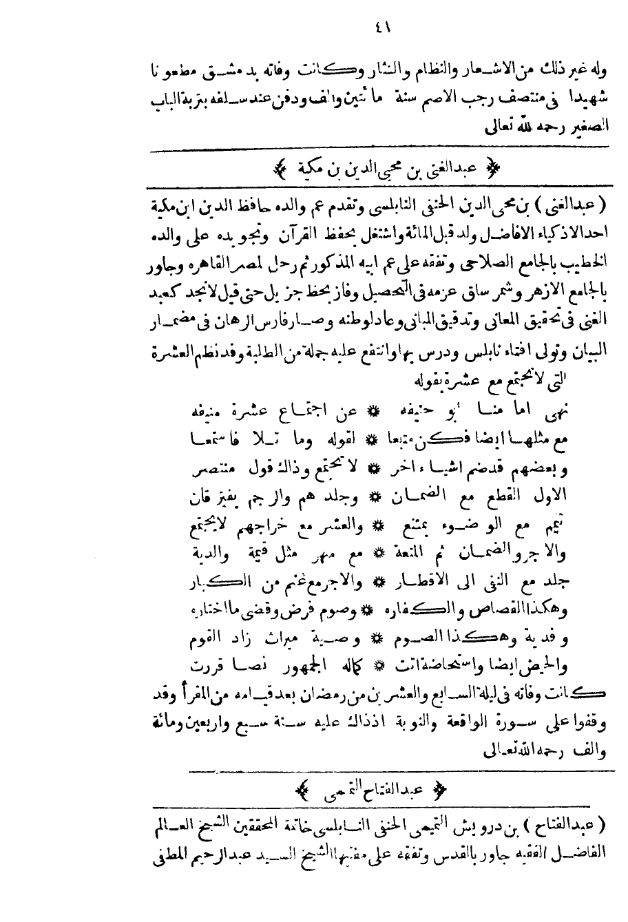 عبد الغني بن محيي الدين الحنفي النابلسي وتقدم عم والده حافظ الدين ابن مكية أحد الأذكياء الأفاضل ولد قبل المائة واشتغل بحفظ القرآن وتجويده على والده الخطيب بالجامع الصلاحي وتفقه على عم أبيه المذكور ثم رحل لمصر القاهرة وجاور بالجامع الأزهر وشمر ساق عزمه في التحصيل وفاز بحظ جزيل حتى قيل لا نجد كعبد الغنى في تحقيق المعاني وتدقيق المباني وعاد لوطنه وصار فارس الرهان في مضمار البيان وتولى افتاء نابلس ودرس بها وانتفع عليه جملة من الطلبة وفد نظم العشرة التي لا تجتمع مع عشرة بقوله