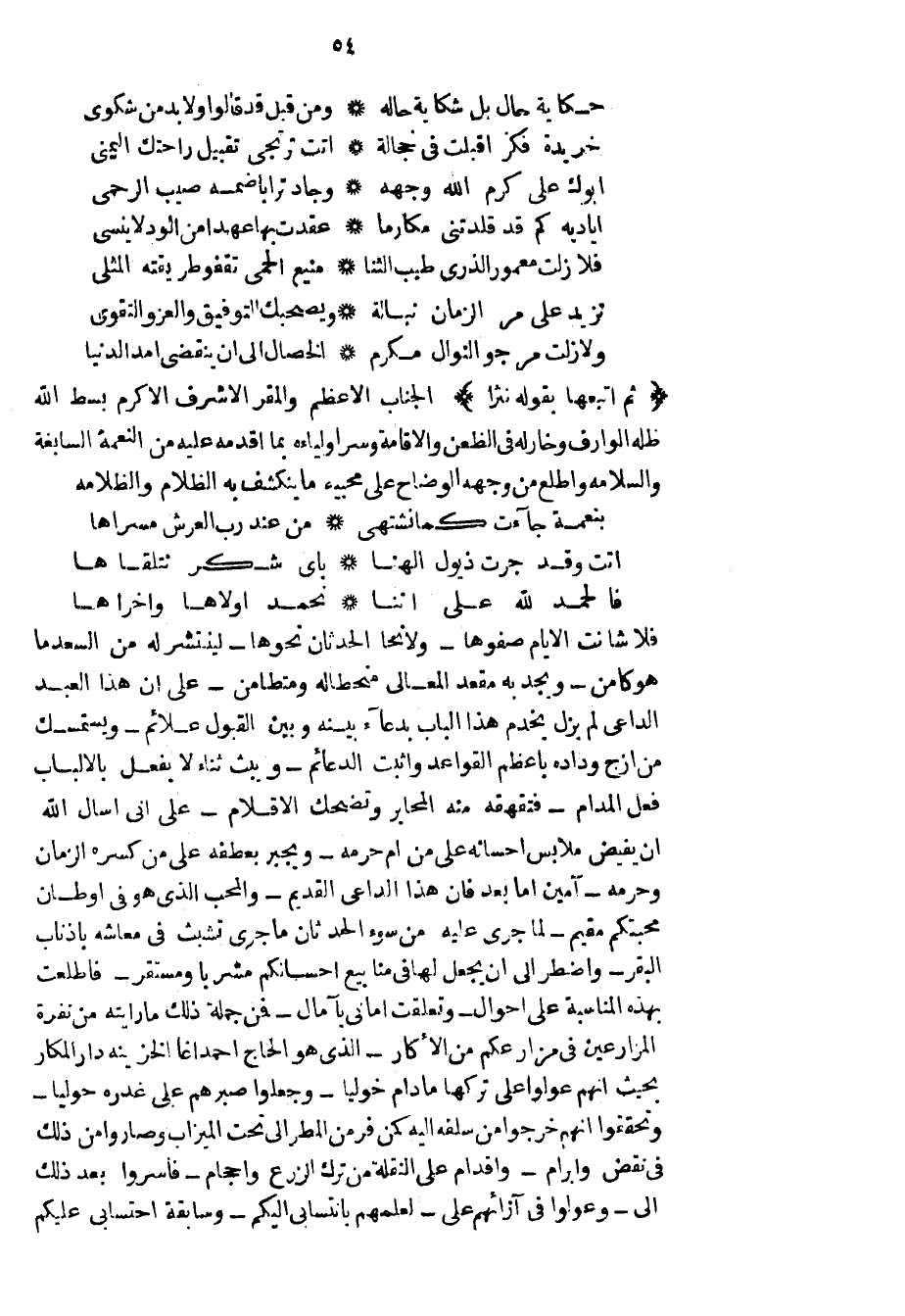 ثم اتبعها بقوله نثراً الجناب الأعظم والمقر الأشرف الأكرم بسط الله ظله الوارف وخار له في الظعن والاقامة وسر أولياءه بما أقدمه عليه من النعمة السابغة والسلامة واطلع من وجهه الوضاح على محبيه ما ينكشف به الظلام والظلامه