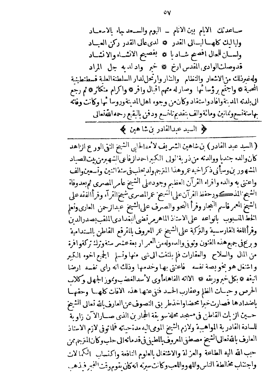 السيد عبد القادر بن شاهين الشريف لأمه الحلبي الشيخ التقي الورع الزاهد كان والده جندياً ووالدته من ذرية الولي الكبير أحمد الرفاعي الشهير من بيت الصياد المشهورين وسيأتي ذكر أخيه عمر وهذا المترجم ولد بحلب في سنة اثنين وتسعين وألف واعتنى به والده وأقرأه القرآن العظيم وجود على الشيخ عامر المصري ثم بعد وفاة الشيخ المذكور حفظ القرآن على الشيخ عمر المصري شيخ القراء وقرأ الفقه على الشيخ المعمر قاسم النجار وقرأ النحو والصرف على الشيخ عبد الرحمن العاري وتعلم الخط المنسبوب بأنواعه على الأستاذ الماهر مرتضى البغدادي الملقب بصدر الدين وقرأ اللغة الفارسية والتركية على الشيخ عمر المعروف بالمقرقع القاطن بالمستدامية وبرع في جميع هذه الفنون وتوفي والده وله من العمر أربعة عشر سنة وترك تركة وافرة من المال والسلاح والعقارات فلم يلتفت إلى شيء منها وتسلم الجميع أخوه الكبير واشتغل هو بخويصة نفسه فاعتنى بها وخدمها وذلك إنه رأى نفسه أرضا أنيقه بكل خير وريقه إلا أنه ألفاها مأوى لأسد الغضب ونمور الجهل وكلاب الحرص وحيات الظلم وعقارب الحسد فنفي عنها هذه الآفات كلها وحفها بأضدادها فصارت خيراً محضاً وأخذ طريق التصوف عن العارف بالله تعالى الشيخ حسين الزيات القاطن في مسجد محلة سويقة الحجارين الذي صار الآن زاوية للسادة القادرية المواهبية ولازم الشيخ المومي إليه مدة حياته فلما توفي لازم الأستاذ العارف بالله تعالى الشيخ مصطفى المعروف باللطيفي في قدماته إلى حلب وكان المترجم ممن حبب الله إليه الطاعة والعزلة والاشتغال بالعلوم النافعة واكتساب الكمالات واجتناب مخالطة الناس واللهو واللعب وكانت سيرته إنه كان يقوم وقت الفجر فيذهب