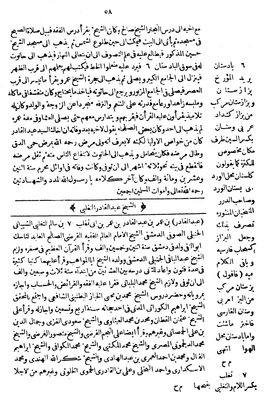 مع أخيه إلى درس النجار الشيخ صالح وكان الشيخ يقرأ درس الفقه قبيل صلاة الصبح في مسجده ثم يأتي إلى البيت فيمكث إلى حين طلوع الشمس ثم يذهب إلى مسجد الشيخ حسين المذكور فيطالع عليه في علم التصوف إلى أن يتعالى النهار فيذهب إلى حانوت له في سوق البادستان فيرد عليه متعلموا الخط فيكتب لهم يعلمهم إلى قرب الظهر فينزل إلى الجامع الكبير ويصلي ثم يذهب إلى حجرة الشيخ عمر ويقرأ ما تيسر إلى قرب العصر فيصلي في الجامع المزبور ويرجع إلى حانوته فيأخذ ما يحتاج وكان متقشفاً في مأكله وملبسه زاهداً ورعاً مع قدرته على التنعم والترفه متجرداً عن الزوجة والولد وكان له تلاميذ يقرأون عليه القرأن فيقريهم ويتدارس معهم حتى يصلي العشا وفي مدة عمره لم يذهب إلى أحد وكان بعض الصلحاء يقول لأخيه بعد وفاته إن أخاك السيد عبد القادر كان من خواص الأولياء لكنه لا يعرف إنه ولي مرض رحمه الله بمرض حمي الدق وطال مرضه فكان يتحامل ويذهب إلى الحانوت لأنتفاع الناس منه ثم ثقل مرضه فانقطع في بيته نحو ثلاثة أشهر إلى أن توفي وكانت وفاته في أوائل محرم سنة اثنين وعشرين ومائة وألف وكان آخر كلامه يا رسول الله المدد والشهادتين رحمه الله تعالى وأموات المسلمين أجمعين.