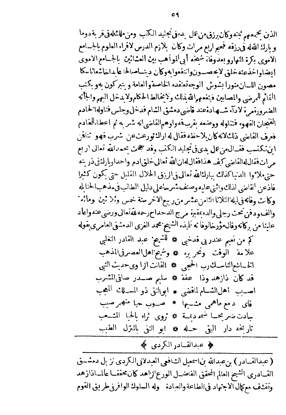 الذين يجمعهم ثبته وكان يرزق من عمل يده في تجليد الكتب ومن ملك له في قرية دوما وبارك الله له في رزقه فحج أربع مرات وكان يلازم الدرس لأقراء العلوم بالجامع الأموي بكرة النهار وبعد وفاة شيخه أبي المواهب بين العشائين بالجامع الأموي أيضاً وأخذ عنه خلق لا يحصون وانتفعوا به وكان ديناً صالحاً عابداً خاشعاً ناسكاً مصون اللسان منوراً بشوش الوجه تعتقده الخاصة والعامة ويتبركون به ويكتب التمائم للمرضى والمصابين فينفعهم الله بذلك ولا يخالط الحكام ولا يدخل اليهم وألجأته الضرورة مرة لأداء شهادة عند قاضي دمشق الشام فدخل وجلس فناوله الخادم الفنجان القهوة فتناوله ووضعه بقرب فمنه وأوهم القاضي إنه شربه ثم أعطاه للخادم فعرف القاضي ذلك لأنه كان يلاحظه فقال له أراك تورعت عن شرب قهوتنا فمن أين تكتسب فقال من عمل يدي في تجليد الكتب وقد حججت بحمد الله تعالى أربع مرات فقال له القاضي كيف هذا فقال له إن الله تعالى خلق آدم واحداً وبارك في ذريته حتى ملأوا الدنيا كذلك يبارك الله تعالى في الرزق الحلال القليل حتى يكون كثيراً فأذعن القاضي لذلك وأثنى عليه وصنف شرحاً على دليل الطالب في مذهب الحنابله وكانت وفاته في ليلة الثلاثاء الثامن عشر من ربيع الآخر سنة خمس وثلاثين ومائة وألف ودفن تحت رجلي والده بمقبرة مرج الدحداح رحمه الله تعالى ورضي عنه وأعاد علينا من بركاته وقال مؤرخاً لوفاته تلميذه الشيخ محمد الغزي الدمشقي العامري بقوله