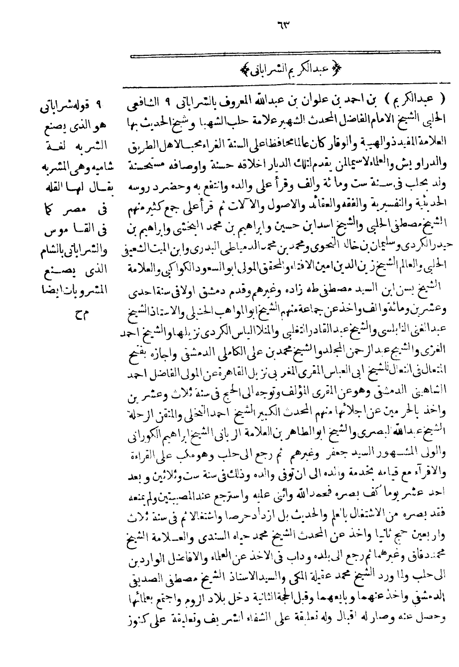 عبد الكريم بن أحمد بن علوان بن عبد الله المعروف بالشراباتي الشافعي الحلبي الشيخ الامام الفاضل المحدث الشهير علامة حلب الشهبا وشيخ الحديث بها العلامة المفيد ذو الهيبة والوقار كان عالماً محافظاً على السنة الغراء محباً لأهل الطريق والدراويش والعلماء لا سيما لمن يقدم لتلك الديار أخلاقه حسنة وأوصافه مستحسنة ولد بحلب في سنة ست ومائة وألف وقرأ على والده وانتفع به وحضر دروسه الحديثية والتفسيرية والفقه والعقائد والأصول والآلات ثم قرأ على جمع كثير منهم الشيخ مصطفى الحلبي والشيخ أسد ابن حسين وإبراهيم بن محمد البخشي وإبراهيم بن حيدر الكردي وسليمان بن خالد النحوي ومحمد بن محمد الدمياطي البدري وابن الميت الشعيفي الحلبي والعالم الشيخ زين الدين أمين الافتاء والمحقق المولى أبو السعود الكواكبي والعلامة الشيخ يسن ابن السيد مصطفى طه زاده وغيرهم وقدم دمشق أولاً في سنة احدى وعشرين ومائة وألف وأخذ عن جماعة منهم الشيخ أبو المواهب الحنبلي والأستاذ الشيخ عبد الغني النابلسي والشيخ عبد القادر التغلبي والمنلا الياس الكردي نزيلها والشيخ أحمد الغزي والشيخ عبد الرحمن المجلد والشيخ محمد بن علي الكاملي الدمشقي وأجازه بفتح المتعال في النعال للشيخ أبي العباس المقري المغربي نزيل القاهرة عن المولى الفاضل أحمد الشاهيني الدمشقي وهو عن المقري المؤلف وتوجه إلى الحج في سنة ثلاث وعشرين وأخذ بالحرمين عن أجلائها منهم المحدث الكبير الشيخ أحمد النخلي والمتقن الرحلة الشيخ عبد الله البصري والشيخ أبو الطاهر بن العلامة الرباني الشيخ إبراهيم الكوراني والولي المشهور السيد جعفر وغيرهم ثم رجع إلى حلب وهو مكب على القراءة والاقراء مع قيامه بخدمة والده إلى أن توفي والده وذلك في سنة ست وثلاثين وبعد أحد عشر يوماً كف بصره فحمد الله وأثنى عليه واسترجع عند المصيبتين ولم يمنعه فقد بصره من الاشتغال بالعلم والحديث بل ازداد حرصاً واشتغالاً ثم في سنة ثلاث وأربعين حج ثانياً وأخذ عن المحدث الشيخ محمد حياه السندي والعلامة الشيخ محمد دقاق وغيرهما ثم رجع إلى بلده ودأب في الأخذ عن العلماء والأفاضل الواردين إلى حلب ولما ورد الشيخ محمد عقيلة المكي والسيد الأستاذ الشيخ مصطفى الصديقي الدمشقي وأخذ عنهما وبايعهما وقبل الحجة الثانية دخل بلاد الروم واجتمع بعلمائها وحصل عنه وصار له اقبال وله تعليقة على الشفاء الشريف وتعليقة على كنوز